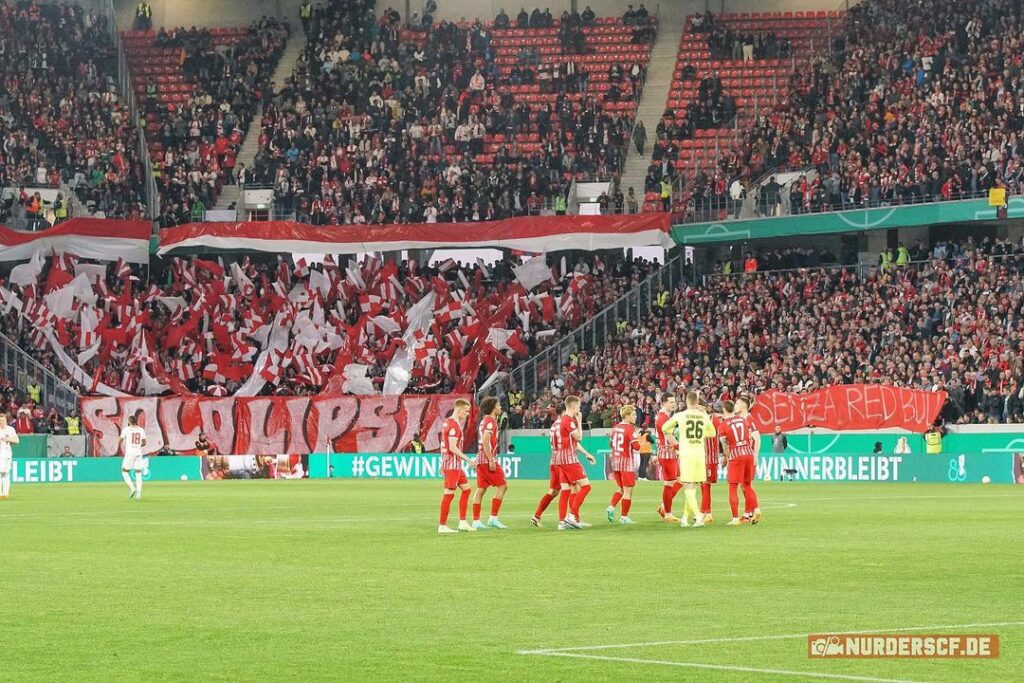 Beim gestrigen Halbfinale im DFB-Pokal zwischen dem SC Freiburg und Rasenballsport Leipzig war im Gästeblock des Mooswaldstadions eine „Solo Lipsia“ (Nur Leipzig) Aktion mit Fahnen, Bändern und Luftballons zu sehen. Doch Ultras des SC Freiburg veränderten die Botschaft.