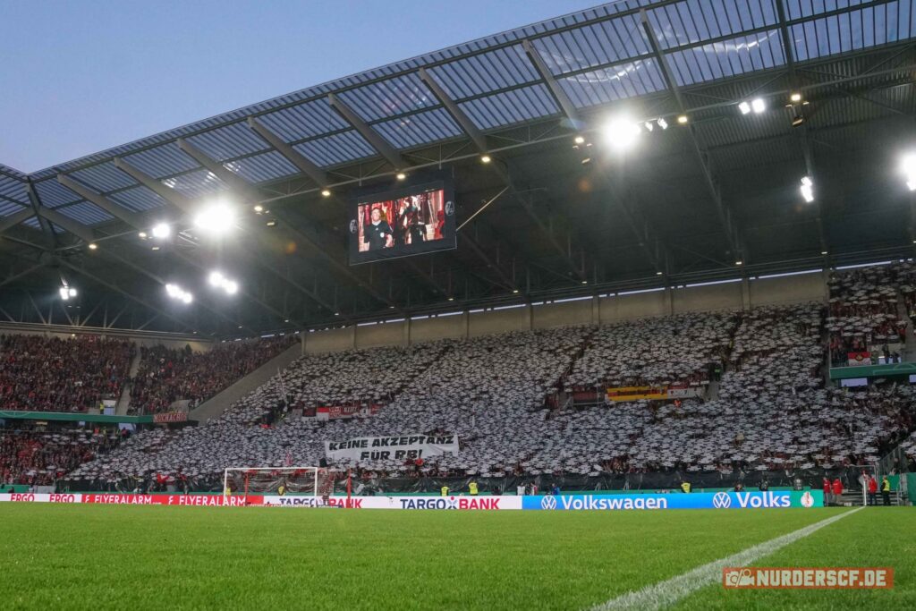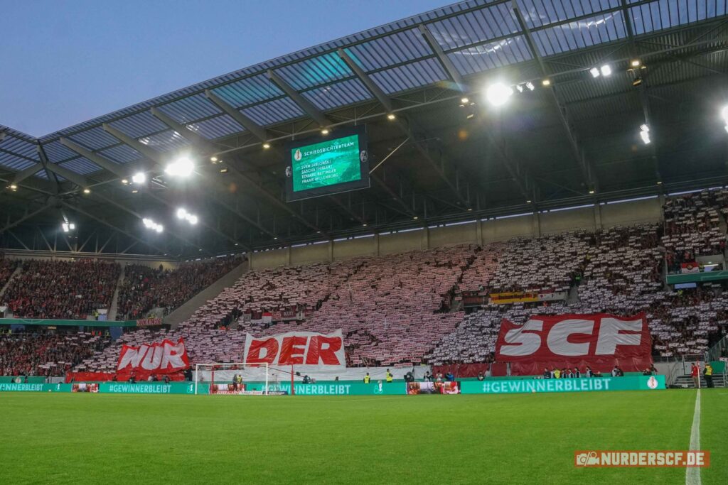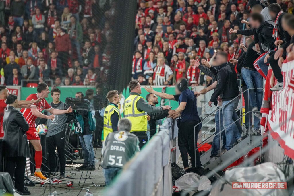 Auf dem Rasen gewann RB Leipzig das gestrige Auswärtsspiel in Freiburg deutlich mit 5-1 und zog damit zum zweiten Mal in Folge ins Pokalfinale ein. In der Schlussphase des Spiels kam es noch zu einer Rangelei der Spieler auf dem Rasen. RB Leipzig-Spieler André Silva wurde dabei von einer Münze aus dem Heimbereich getroffen und ging zu Boden. Mehrere SC-Fans betraten in dieser hitzigen Situation kurzzeitig den Innenraum (Aktion im Video). „Ich lege mich da einfach nicht hin. Ich habe letzte Woche auf Schalke bei einem Eckball glaube ich auch fünf Feuerzeuge in den Rücken gekriegt“, kritisierte SC Freiburg-Kapitän Christian Günter im Nachgang des Pokalspiels die Reaktion von Silva auf den Münzwurf. Im Vorfeld des Spiels hatte die Freiburger Fanszene einen Treffpunkt ausgerufen, um gemeinsam zum Stadion zu ziehen. (Faszination Fankurve, 03.05.2023)