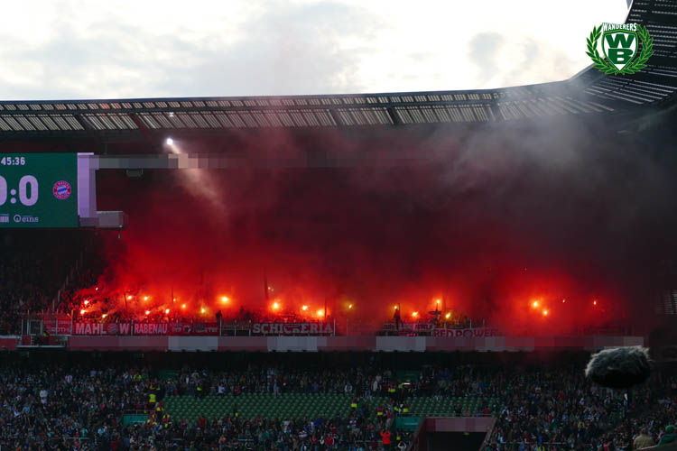 Ultras des FC Bayern München leiteten die 2. Halbzeit des Samstagabendspiels der Bundesliga gestern mit einer großen Pyroshow im Gästeblock des Weserstadions ein. Nach dem Spiel wurden fünf Busse der aktiven FC Bayern-Fanszene vor den Toren von Bremen stundenlang von der Polizei kontrolliert.