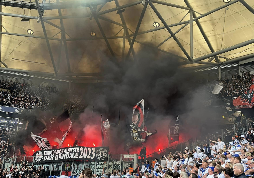 Die mitgereisten Fans von Eintracht Frankfurt zeigten zuvor eine „Sportgemeinde Eintracht“-Choreografie und zündeten zu Beginn der 2. Halbzeit hinter einem „Europapokalsieger der Randale 2023“-Banner Pyrotechnik, Rauch und Raketen. Als Dresscode hatten die Ultras Frankfurt “Alle in Schwarz nach Gelsenkirchen” ausgerufen. Die Schalke-Fans in der Arena folgten dem Aufruf der Ultras Gelsenkirchen und teilten Ober- und Unterrang in Blau und Weiß auf. Die Aktion wurde mit einer „Blau und Weiß werd ich für immer tragen!“-Botschaft abgerundet. Außerdem wurde auch in der Nordkurve Pyrotechnik abgebrannt. Auf dem Rasen gelang Schalke in der 85. Minute der Ausgleich zum 2:2 Endstand, was für die Knappen einen wichtigen Punkt im Abstiegskampf bedeutete. (Faszination Fankurve, 20.05.2023)