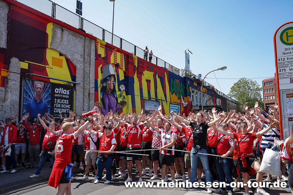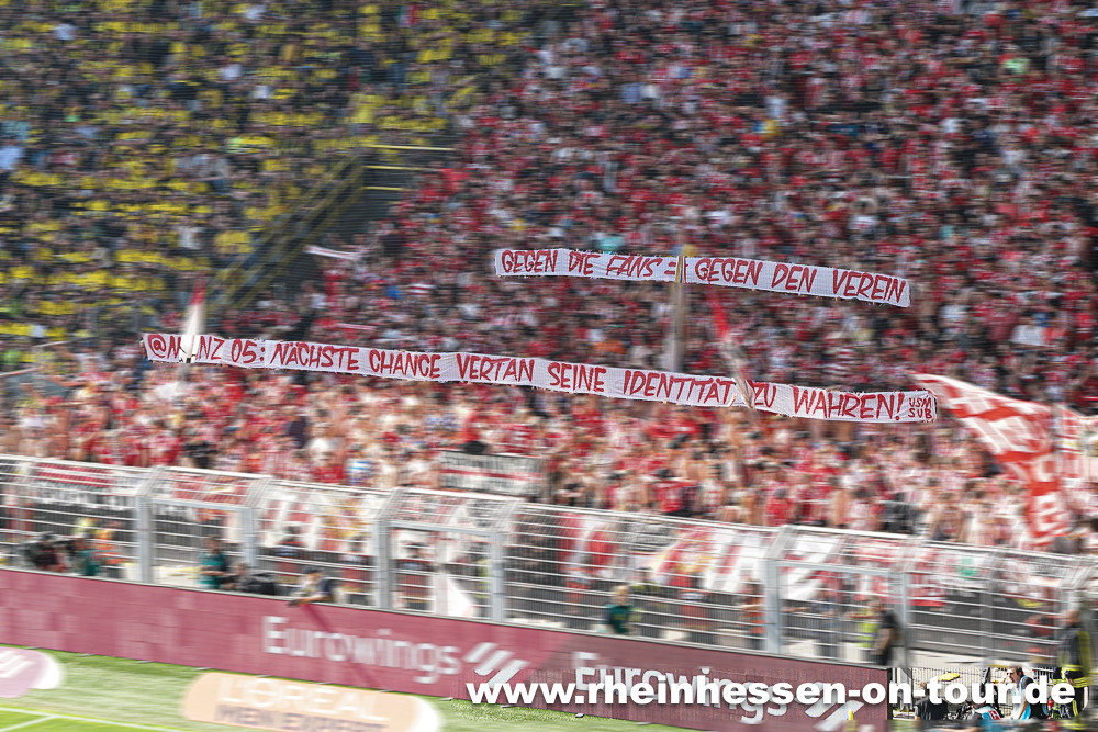 Die Zug der Mainz 05-Fans musste über den Dortmunder Hauptbahnhof umgeleitet werden. Mit einem „Gegen die Fans = Gegen den Verein – @Mainz05: Nächste Chance vertan seine Identität zu wahren!“-Plakat kritisierten die Ultras aus Mainz das Abstimmungsverhalten des eigenen Vereins bei der außerordentlichen Mitgliederversammlung der DFL unter der Woche. (Faszination Fankurve, 29.05.2023)
