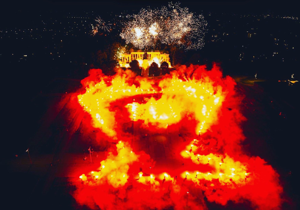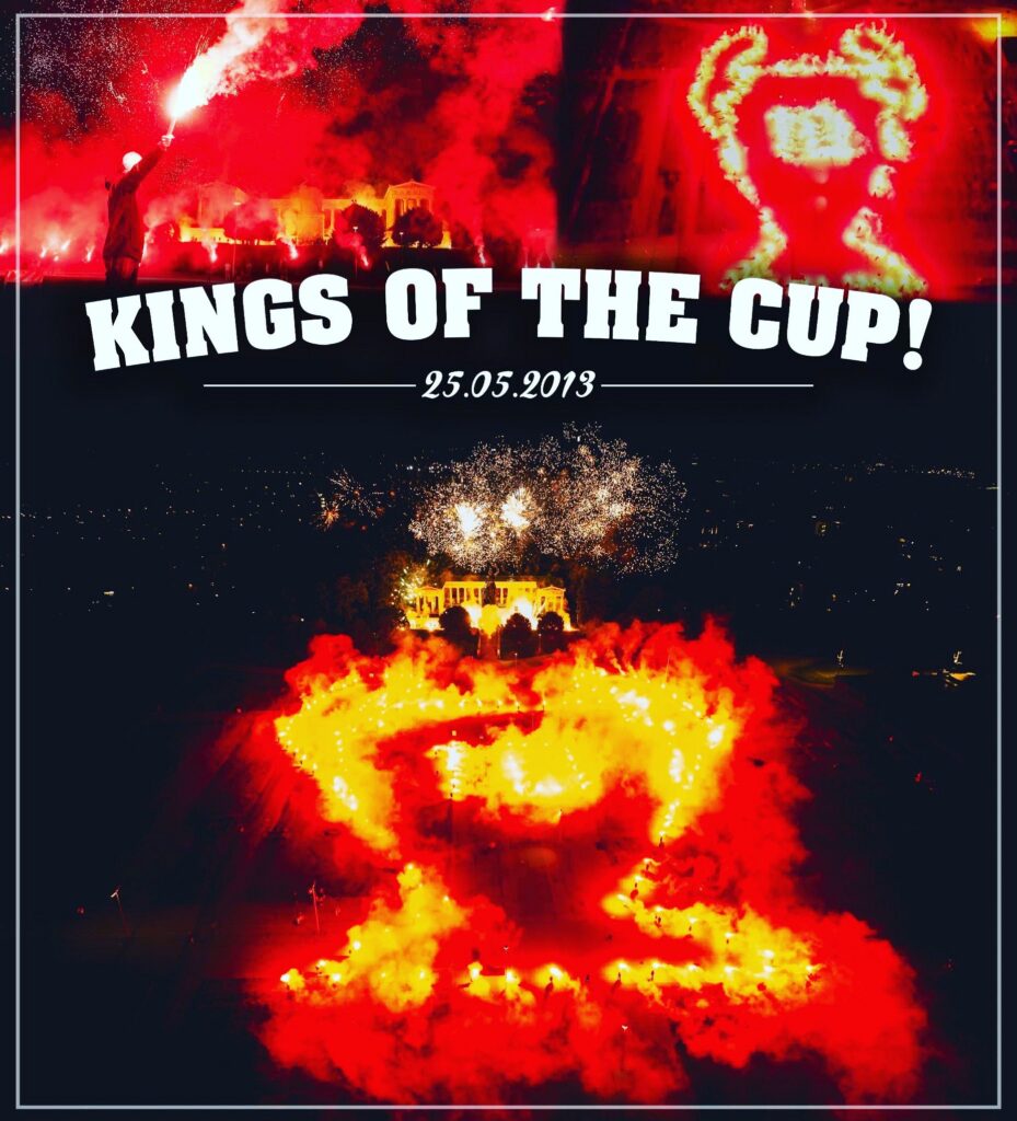 Die Bayern-Fans versammelten sich gestern Abend unter dem Motto „KINGS OF THE CUP -25.05.2013“ an der Bavaria-Statue in München und formten den Champions League-Pokal aus roten Bengalischen Fackeln. Abgerundet wurde die Aktion mit einem kleinen Feuerwerk. (Faszination Fankurve, 26.05.2023)