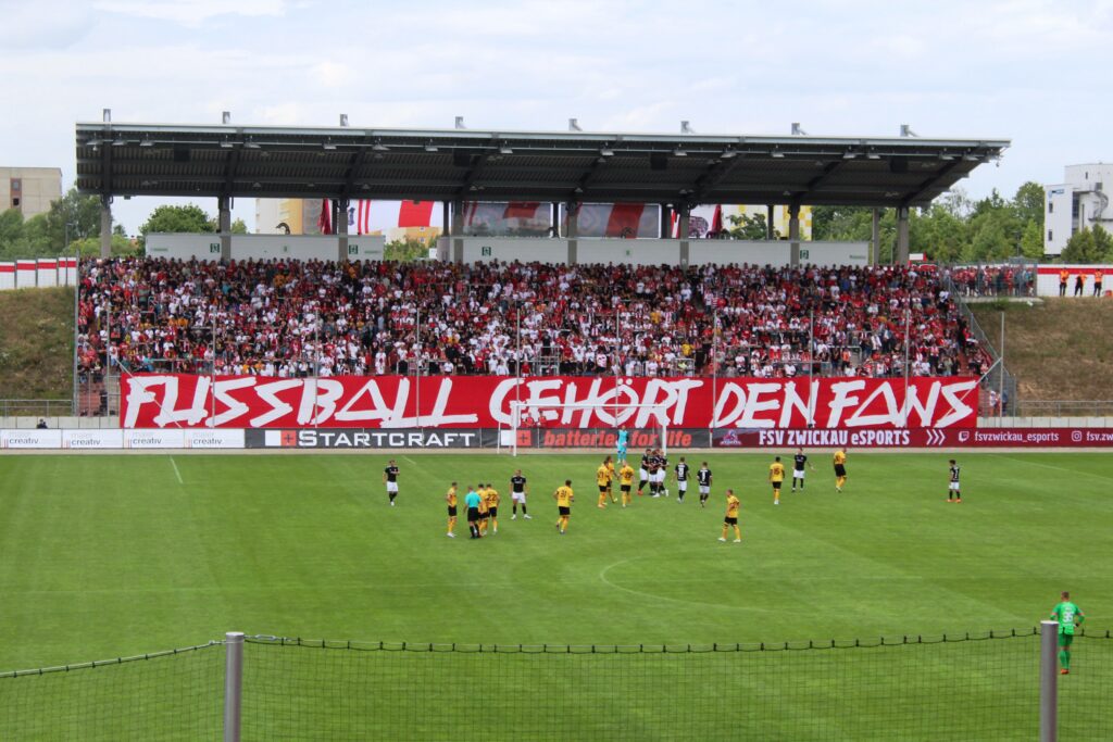 5.979 Fans besuchten am vergangenen Samstag die Saisoneröffnung des FSV Zwickau sowie das dazugehörige „Eene Bande hält zusammen“-Freundschaftsspiel gegen Dynamo Dresden. Die „FUSSBALL GEHÖRT DEN FANS!“-Aktion der FSV Zwickau-Fanszene zur Rettung des eigenen Vereins stand dabei im Fokus.