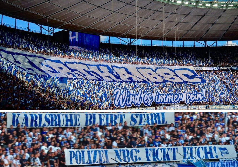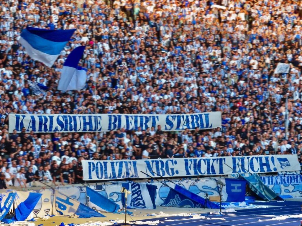 „Karlsruhe bleibt stabil – Polizei NBG: Fickt euch!“, war auf einem Spruchband der Ultras von Hertha BSC zu lesen, die eine Freundschaft nach Karlsruhe pflegen. Am frühen Donnerstagmorgen wurden im Raum Karlsruhe und in Pforzheim fünf Wohnungen von KSC-Fans durchsucht. Ein KSC-Fan wurde dabei in Untersuchungshaft genommen. „Am 03.08.2023 wurde ein Mitglied der organisierten Fanszene des Karlsruher SC aufgrund eines Haftbefehls des Amtsgerichts Nürnberg festgenommen. Es besteht der dringende Tatverdacht des Raubes und der gefährlichen Körperverletzung. Am 08.04.2023 kam es nach einem Spiel der 2. Fußball-Bundesliga am Hauptbahnhof Nürnberg zu einer Auseinandersetzung zwischen Fans des 1. FC Nürnberg und einer Gruppe von Personen, die der organisierten Fanszene des Karlsruher SC angehören. Diese nahmen mehreren Club-Anhängern die Fanschals ab, wobei gegenüber zwei Personen erhebliche Gewalt angewendet wurde. Nachdem die Kriminalpolizei Nürnberg unter Leitung der Staatsanwaltschaft Nürnberg-Fürth mehrere Tatverdächtige ermitteln konnte, wurden am 03.08.2023 in den frühen Morgenstunden im Raum Karlsruhe und Pforzheim fünf Durchsuchungsbeschlüsse vollstreckt. Eine Person wurde wegen des Verdachts des Raubes und der gefährlichen Körperverletzung in Untersuchungshaft genommen. Der Festgenommene hatte einen am Boden liegenden Geschädigten mit dem Fuß so wuchtig gegen das Gesicht getreten, dass die Gefahr lebensgefährlicher Verletzungen bestand“, teilte die zuständige Staatsanwältin dazu mit.