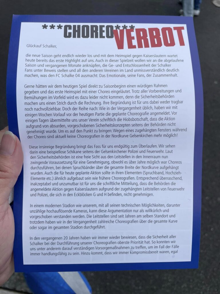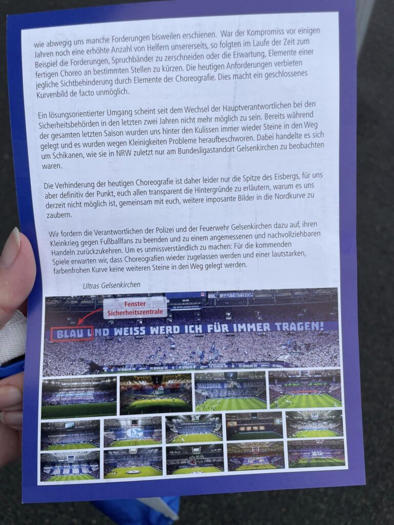 Gerne hätten wir dem heutigen Spiel direkt zu Saisonbeginn einen würdigen Rahmen gegeben und das erste Heimspiel mit einer Choreo eingeläutet. Trotz aller Vorbereitungen und Bemühung im Vorfeld wird es dazu leider nicht kommen, denn die Sicherheitsbehörden machen uns einen Strich durch die Rechnung. Ihre Begründung ist für uns dabei weder tragbar noch nachvollziehbar. Doch der Reihe nach: Wie in der Vergangenheit üblich haben wir mit einigen Wochen Vorlauf vor der heutigen Partie die geplante Choreografie angemeldet. Vor einigen Tagen übermittelte uns dann unser Verein schriftlich die Hiobsbotschaft, dass die Aktion aufgrund von absurden, vorgeschobenen Sicherheitskonzepten seitens der Behörden nicht genehmigt wurde. Um es auf den Punkt zu bringen: Wegen eines zugehängten Fensters während der Choreo sind aktuell keine Choreografien in der Nordkurve Gelsenkirchen mehr möglich!