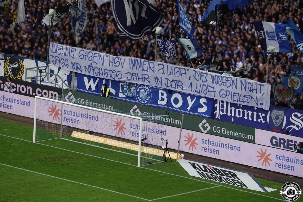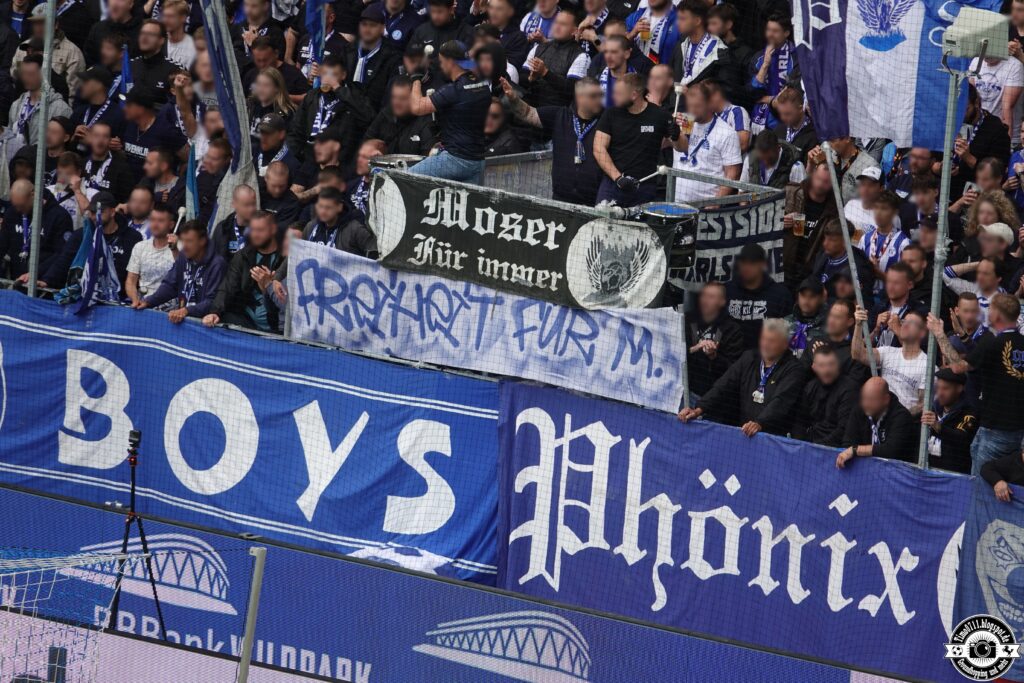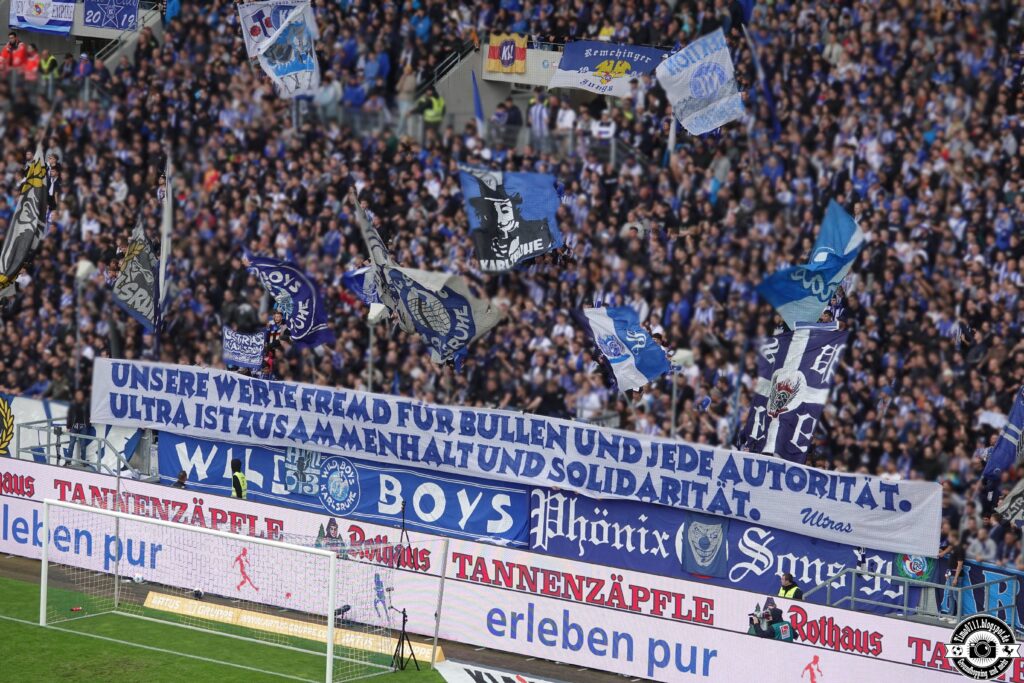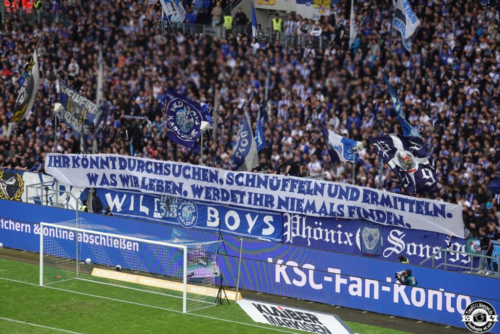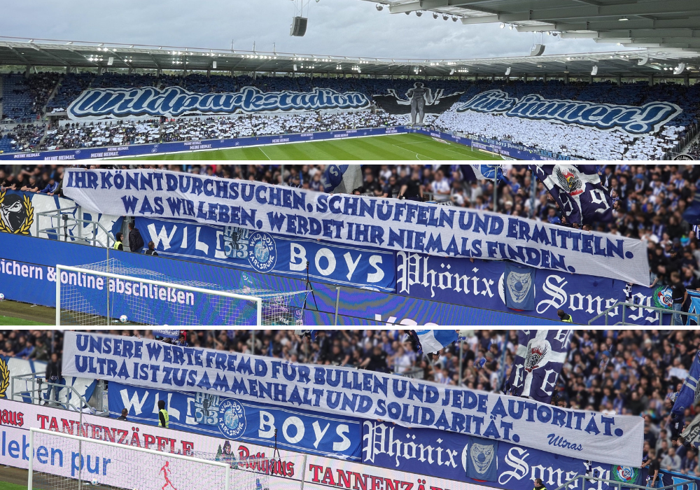 Die Ultras des Karlsruher SC thematisierten zudem noch die Wohnungsdurchsuchungen bei KSC-Ultras. Am frühen Donnerstagmorgen wurden im Raum Karlsruhe und in Pforzheim fünf Wohnungen durchsucht. Ein KSC-Fan wurde dabei in Untersuchungshaft genommen. „Am 03.08.2023 wurde ein Mitglied der organisierten Fanszene des Karlsruher SC aufgrund eines Haftbefehls des Amtsgerichts Nürnberg festgenommen. Es besteht der dringende Tatverdacht des Raubes und der gefährlichen Körperverletzung. Am 08.04.2023 kam es nach einem Spiel der 2. Fußball-Bundesliga am Hauptbahnhof Nürnberg zu einer Auseinandersetzung zwischen Fans des 1. FC Nürnberg und einer Gruppe von Personen, die der organisierten Fanszene des Karlsruher SC angehören. Diese nahmen mehreren Club-Anhängern die Fanschals ab, wobei gegenüber zwei Personen erhebliche Gewalt angewendet wurde. Nachdem die Kriminalpolizei Nürnberg unter Leitung der Staatsanwaltschaft Nürnberg-Fürth mehrere Tatverdächtige ermitteln konnte, wurden am 03.08.2023 in den frühen Morgenstunden im Raum Karlsruhe und Pforzheim fünf Durchsuchungsbeschlüsse vollstreckt. Eine Person wurde wegen des Verdachts des Raubes und der gefährlichen Körperverletzung in Untersuchungshaft genommen. Der Festgenommene hatte einen am Boden liegenden Geschädigten mit dem Fuß so wuchtig gegen das Gesicht getreten, dass die Gefahr lebensgefährlicher Verletzungen bestand“, teilte die zuständige Staatsanwältin dazu mit. Die KSC-Ultras reagierten darauf mit „Ihr könnt durchsuchen, schnüffeln und ermitteln. War wir leben, werdet ihr niemals finden. Unsere Werte fremd für Bullen und jede Autorität. Ultra ist Zusammenhalt und Solidarität.“- und „Freiheit für M.“-Plakaten.