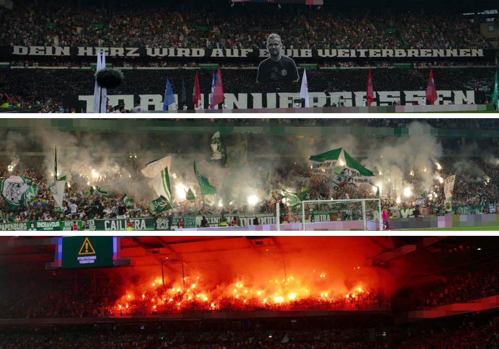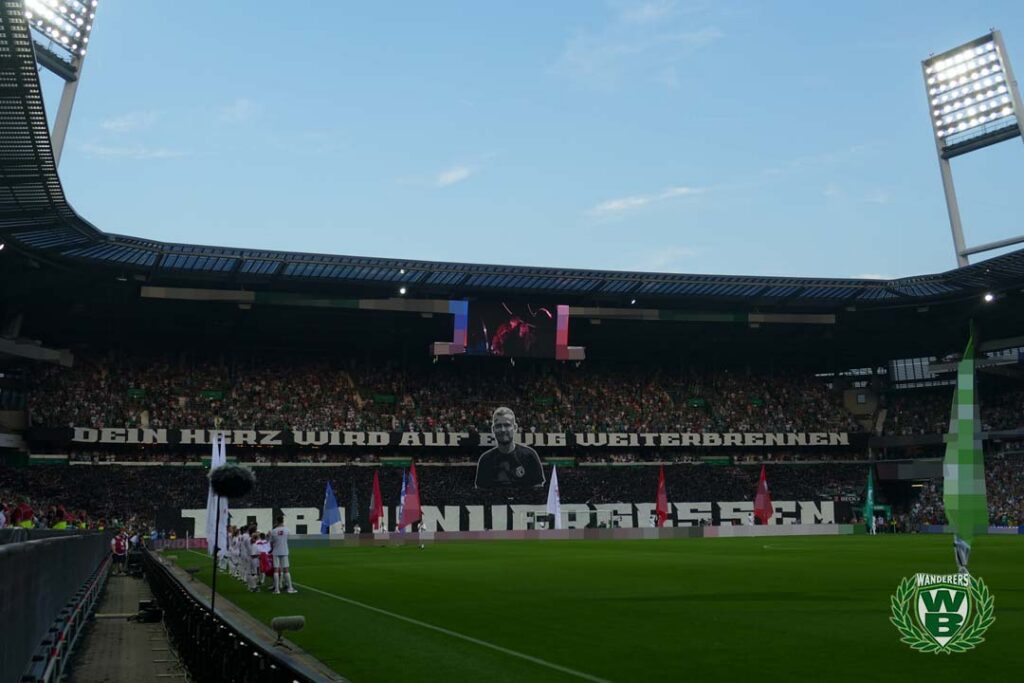 Mit dem Spiel Werder Bremen gegen den FC Bayern München wurde am Freitagabend die Bundesliga-Saison 2023/24 eröffnet. In der Ostkurve zeigten die Werder-Fans zum Anpfiff eine Gedenkchoreografie für einen verstorbenen Werder-Fan.