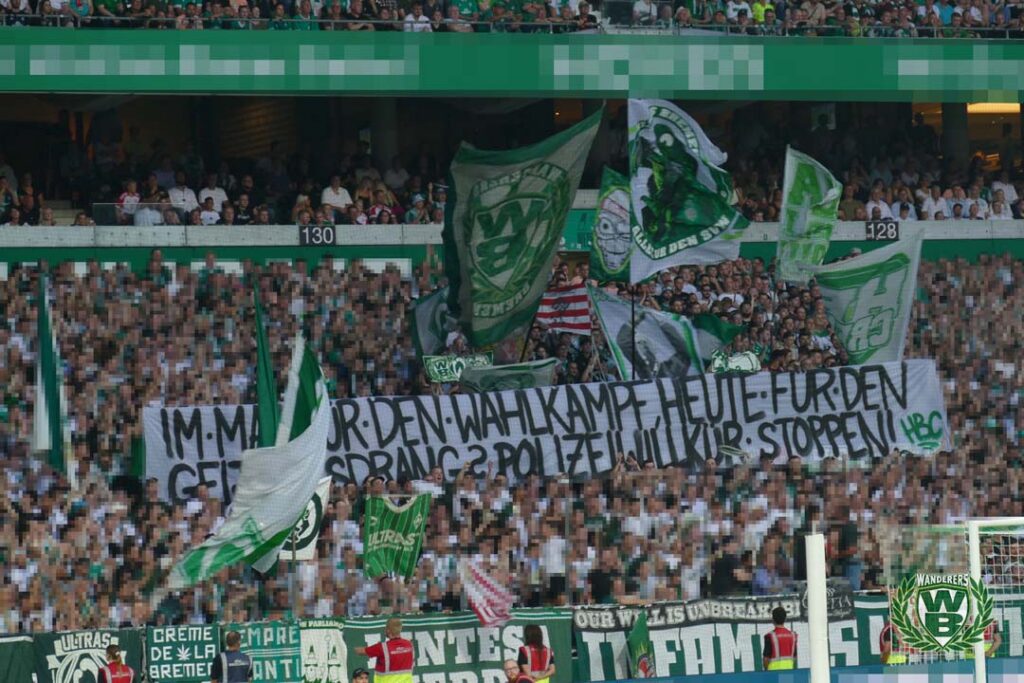 „Im Mai für den Wahlkampf, heute für den Geltungsdrang? Polizeiwillkür stoppen!“, kritisierte die HB Crew am gestrigen Freitag das Vorgehen der Bremer Polizei im Hinblick auf Ereignisse in der Vorsaison. „Freiheit für Gästefans“, war zum gleichen Thema vor der Ost zu lesen. Weitere Plakate gedachten Werder-Legende Horst-Dieter Höttges, der am 22. Juni 2023 verstarb.