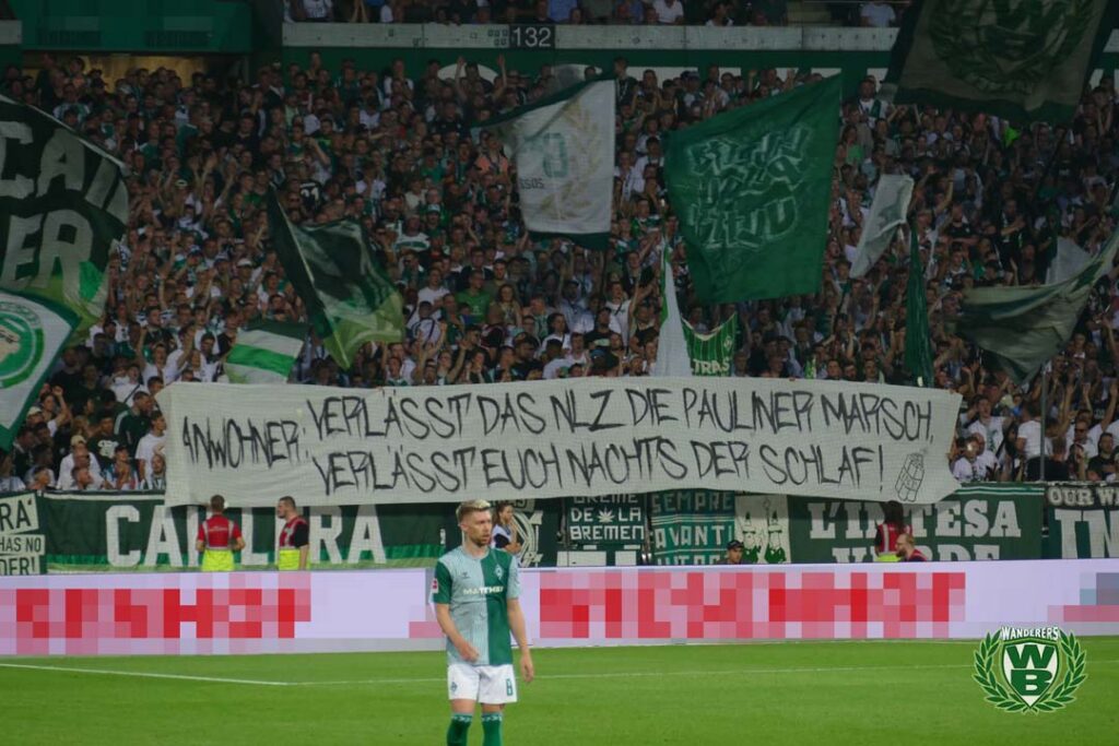 L’Intesa Verde erinnerte an ein Zitat von Uli Hoeneß und zeigte in der Ostkurve ein „’Kein Spieler der Welt ist 100 Millionen Euro wert.’ – Uli H.“-Plakat. Die Gruppe spielte damit auf den Kane-Transfer des FC Bayern an. „Immobilienhaie aus der Ost vertrieben, jetzt müsst ihr aus dem Weserstadion fliegen!“, so die Wanderers Bremen auf einem weiteren Spruchband. Auf einem mit einem Böller markierten Plakat drohten Werder-Ultras in der Diskussion über einen Wegzug des Nachwuchsleistungszentrum von Werder nach Niedersachsen. „Anwohner: Verlässt das NLZ die Pauliner Marsch – verlässt euch nachts der Schlaf!“, so die Ankündigung der Werder-Ultras. „Verein und Stadt gehören untrennbar zusammen – Neues NLZ nur in Bremen!“, ergänzte die HB Crew zu dieser aktuellen Debatte um den Umzug des Nachwuchsleistungszentrums raus aus Bremen. Etwa 350 Anwohner verfügen über ein im Grundbuch verankertes Vetorecht beim Bau des Werder-Nachwuchsleistungszentrum in der Pauliner Marsch.