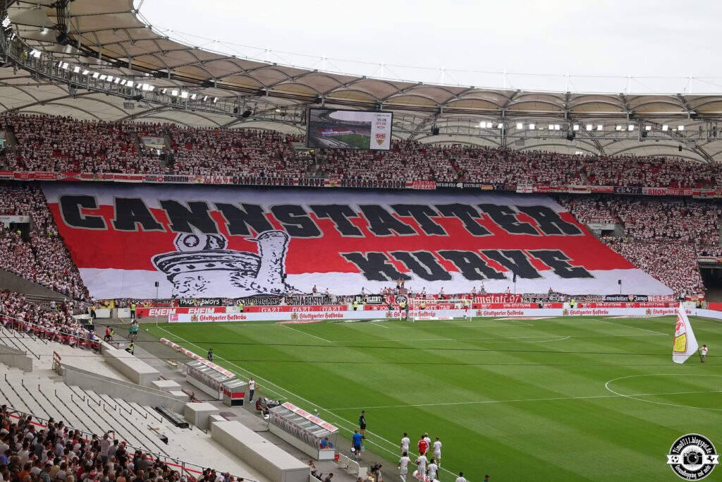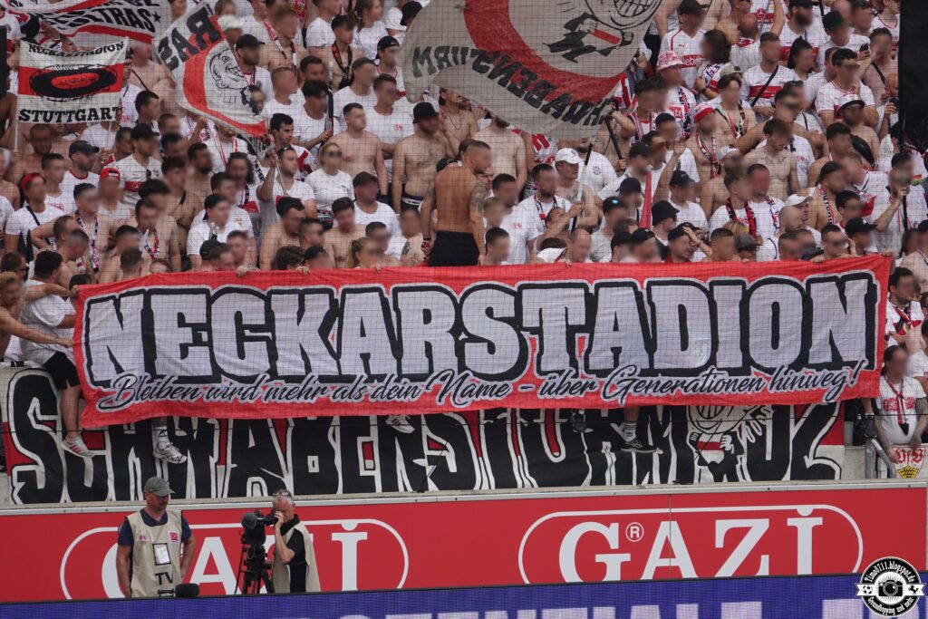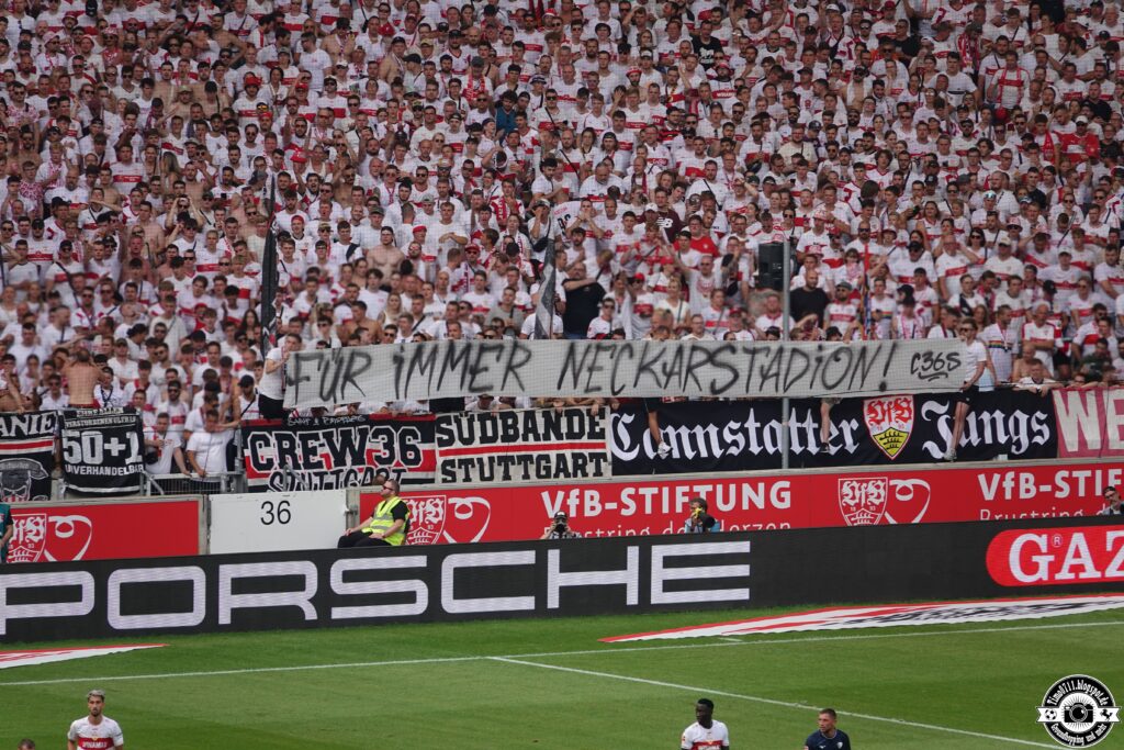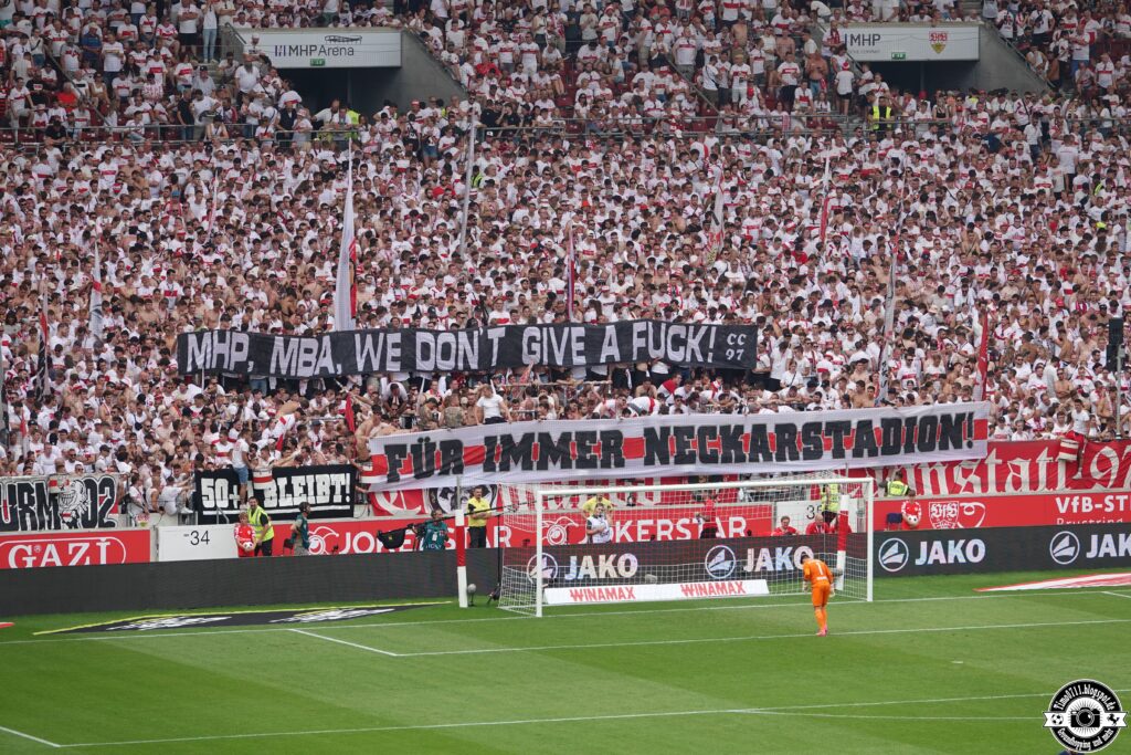 Im Neckarstadion breiteten VfB-Ultras nochmal die bekannte „Cannstatter Kurve“-Blockfahne aus. Mit Plakaten knüpften die Ultragruppen des VfB Stuttgart an das Motto der Karawane Cannstatt an und verbreiteten den Namen Neckarstadion statt des neuen Sponsorennamens MHPArena. „MHP, MBA, we don’t give a fuck!“ (Commando Cannstatt) „Für immer Neckarstadion!“ (Commando Cannstatt, Schwaben Kompanie Stuttgart und Crew 36) und „Neckarstadion – Bleiben wird mehr als dein Name – über Generationen hinweg!“ (Schwabensturm) war auf den Spruchbänder der VfB-Ultras zum Thema zu lesen.