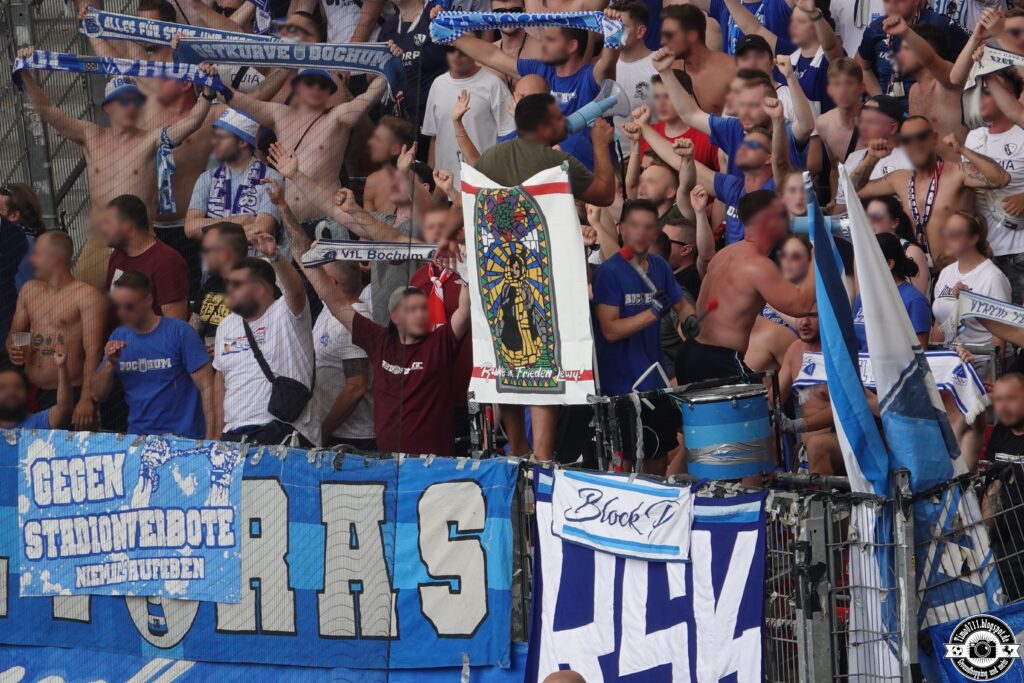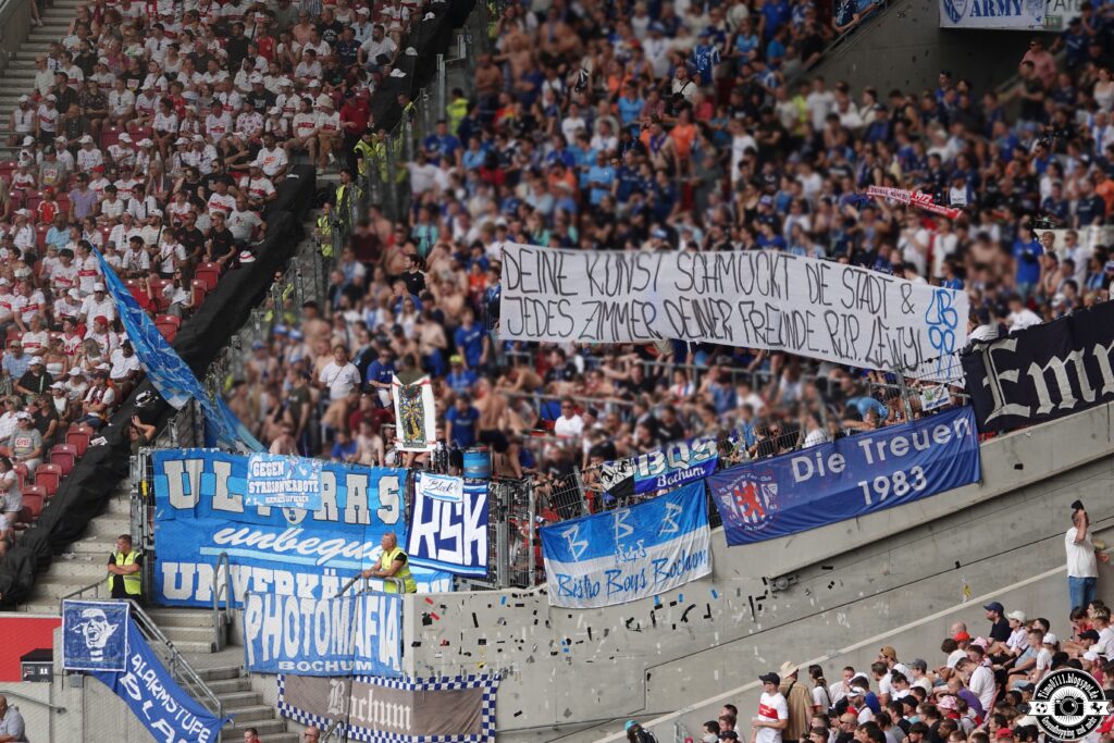 Im Gästeblock breiteten die VfL Bochum-Fans eine Blockfahne mit dem Vereinswappen aus. „Unser Traum bleibt wahr – Bundesliga im dritten Jahr“, war ,dort zu lesen. „Deine Kunst schmückt die Stadt & jedes Zimmer deiner Freunde… R.I.P. Lewy“, gedachten die Ultras Bochum noch an den kürzlich verstorbenen FC Bayern München-Fan.