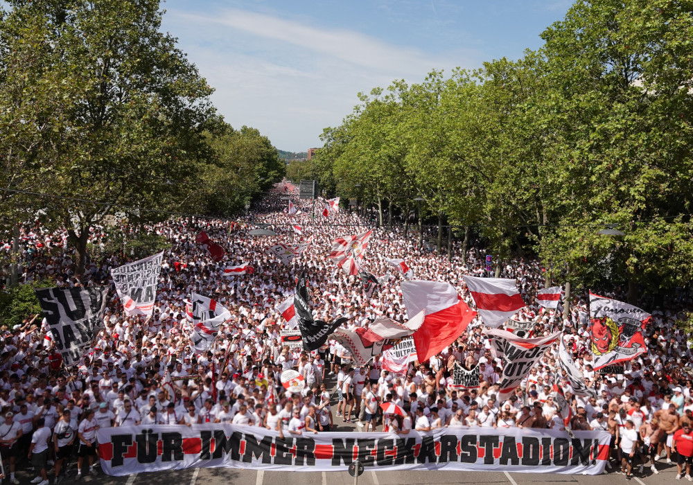 Tausende in Weiß gekleidete VfB Stuttgart-Fans zogen am Samstag unter dem Motto „Für immer Neckarstadion“ in der traditionellen Karawane Cannstatt zum Saisonbeginn durch Stuttgart Bad Cannstatt zum Neckarstadion.