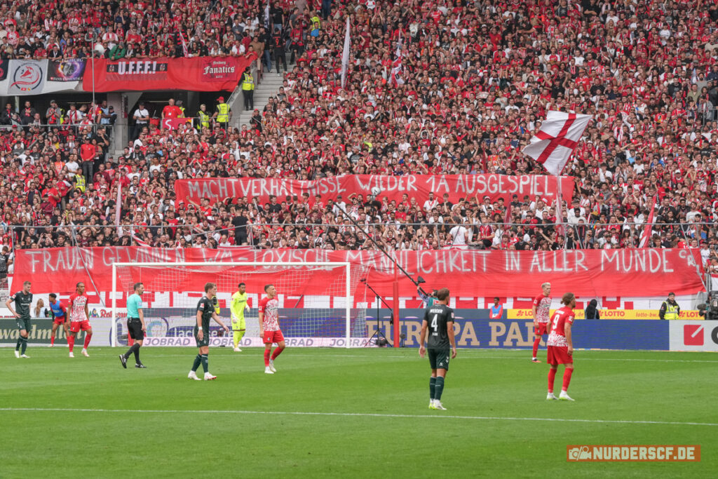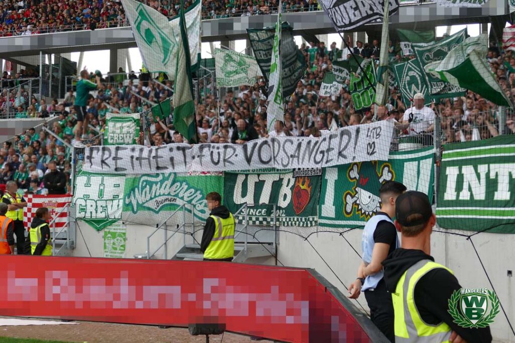 Das UltrA-Team Bremen forderte auf einem Spruchband im Gästeblock noch „Freiheit für Vorsänger!“. Im Mooswaldstadion müssten Vorsänger verschiedener Vereine, die auf den Zaun steigen, um die Stimmung zu koordinieren regelmäßig Strafen zahlen.