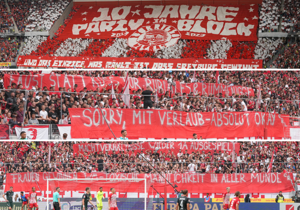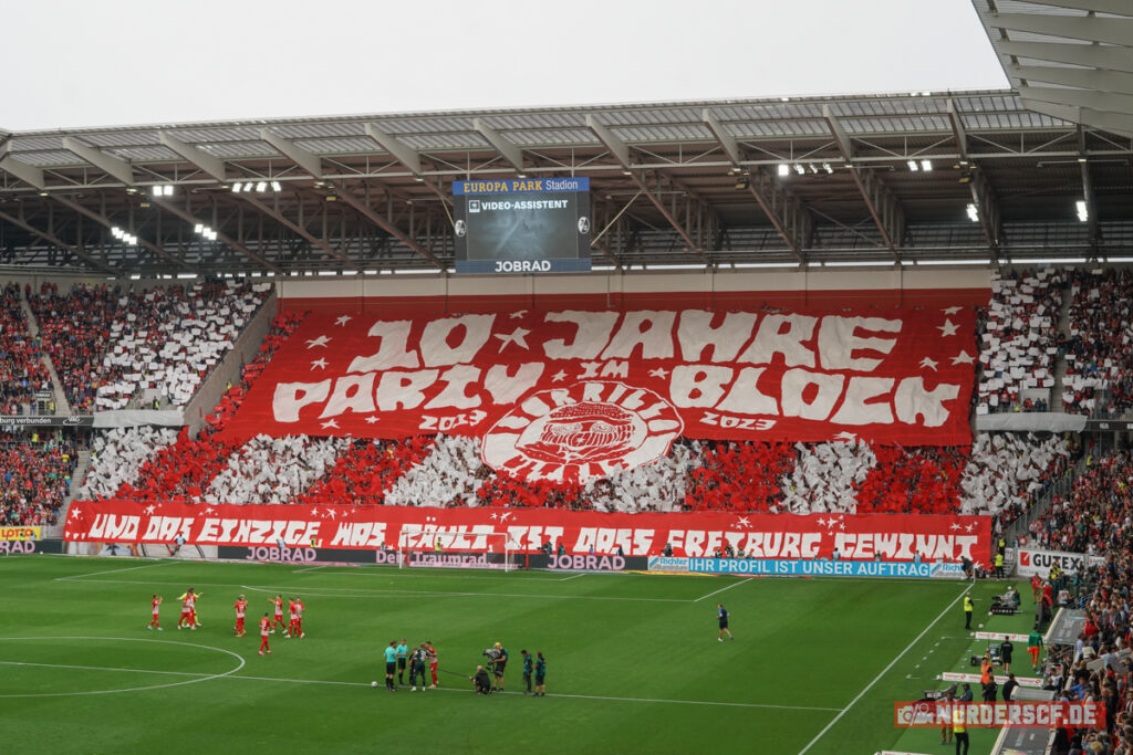 Die Corrillo Ultras des SC Freiburg feierten beim gestrigen Heimspiel gegen Werder Bremen den eigenen zehnten Geburtstag mit einer Choreografie. „10 Jahre Party im Block – und das einzige, was zählt, ist dass Freiburg gewinnt“, lautete das Motto der Aktion.