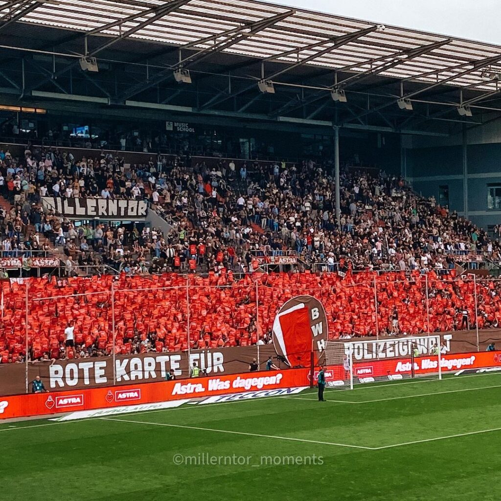 In der Südkurve leiteten die Fans des FC St. Pauli das torlose Zweitligaspiel mit einer „Rote Karte für Polizeigewalt“ der Braun-Weißen Hilfe ein. FC St. Pauli-Fans hielten dabei im Unterrang der Südkurve rote Zettel hoch. (Faszination Fankurve, 28.08.2023)