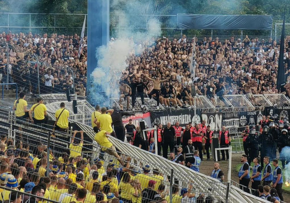 Nach 70 gespielten Minuten flogen beim Pokalspiel zwischen Lok und der Eintracht Böller von Lok-Fans im Bereich hinter Tor 1 am Dammsitz in den Innenraum und explodierten in der Nähe von dort sitzenden Fans im Rollstuhl. Schiedsrichter Michael Bacher unterbrach das Pokalspiel deshalb beim Stand von 3:0 für Frankfurt für 14,5 Minuten und schickte beide Teams in die Katakomben. (Faszination Fankurve, 01.09.2023)