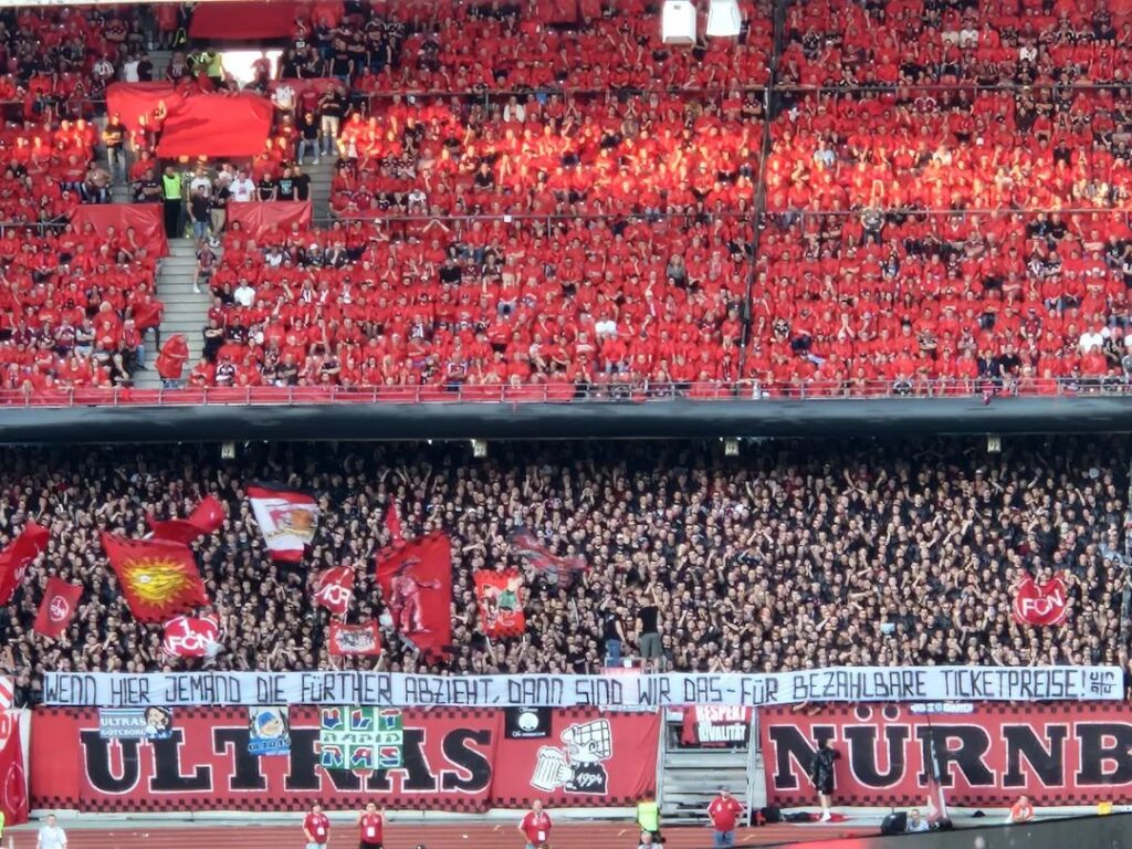 Mit einem „Wenn hier jemand die Fürther abzieht, dann sind wir das – für bezahlbare Ticketpreise!“-Spruchband kritisierten die Ultras Nürnberg die Eintrittspreise des Clubs für Gästefans beim Derby. Die Banda di Amici kritisierte mit einem “Couchingzone.de – Die neue Adresse für alle Hurens*hne!” ein neues VIP-Projekt des FCN unter der gleichnamigen Webadresse. Auf dem Rasen gingen die Gäste aus Fürth bereits in der achten Spielminute in Führung. Michalski köpfte nach einem Eckball vor der Nordkurve ein. Kurz vorm Halbzeitpfiff wurde dem Club durch den Eingriff des VAR ein Elfmeter zugesprochen, den Uzun souverän zum 1:1 verwandelte.