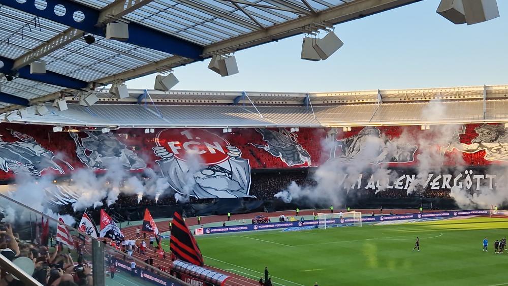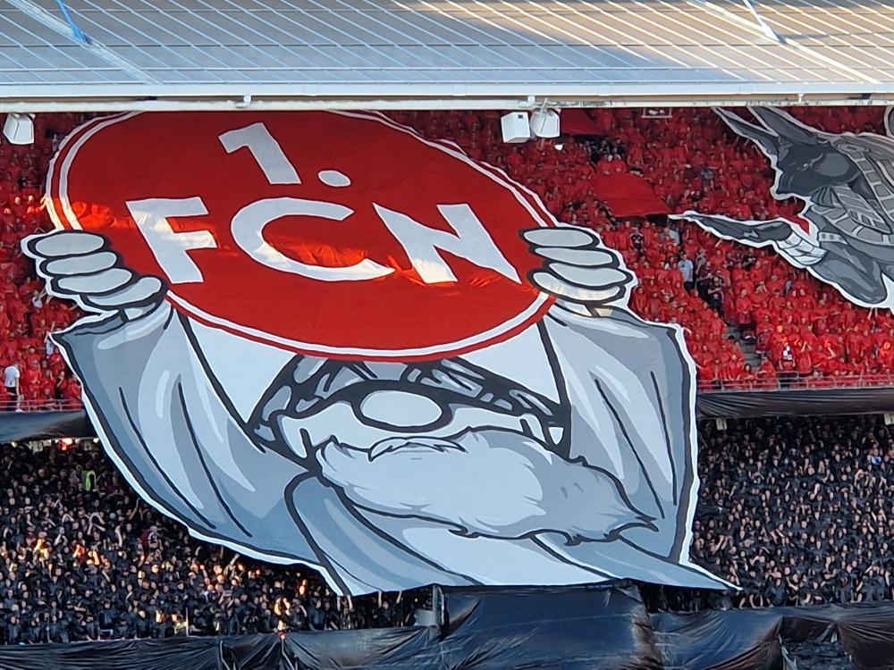 „Von allen verehrt – von allen vergöttert“, lautete das Motto der Choreografie der Ultras Nürnberg, die die gesamte Nordkurve bedeckte. Im Zentrum der Kurve war dabei die Figur Jacky der Ultras Nürnberg in göttlicher Verkleidung zu sehen. Jacky hielt ein FCN-Wappen in die Höhe. Im in Rot getauchten Oberrang waren auf einzelnen Blockfahnen weitere Götter abgebildet. Im schwarzen Unterrang kam hingegen das Motto der Choreografie zum Vorschein. Auch im Nachgang der Kurvenshow behielten die FCN-Fans das rot-schwarze Muster im Ober- und Unterrang bei und trugen Folien-Ponchos.