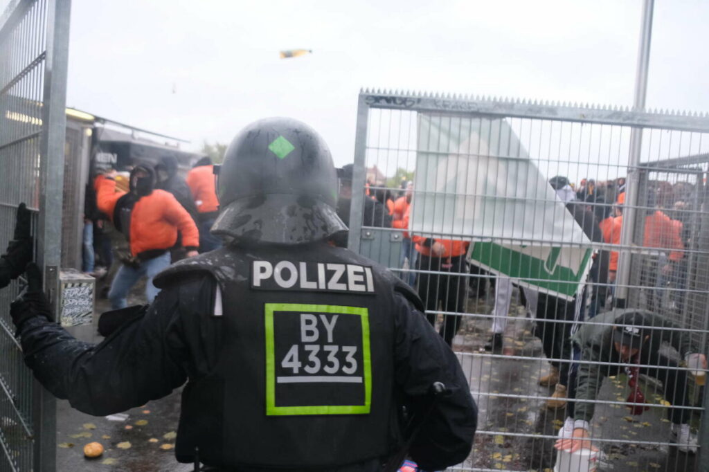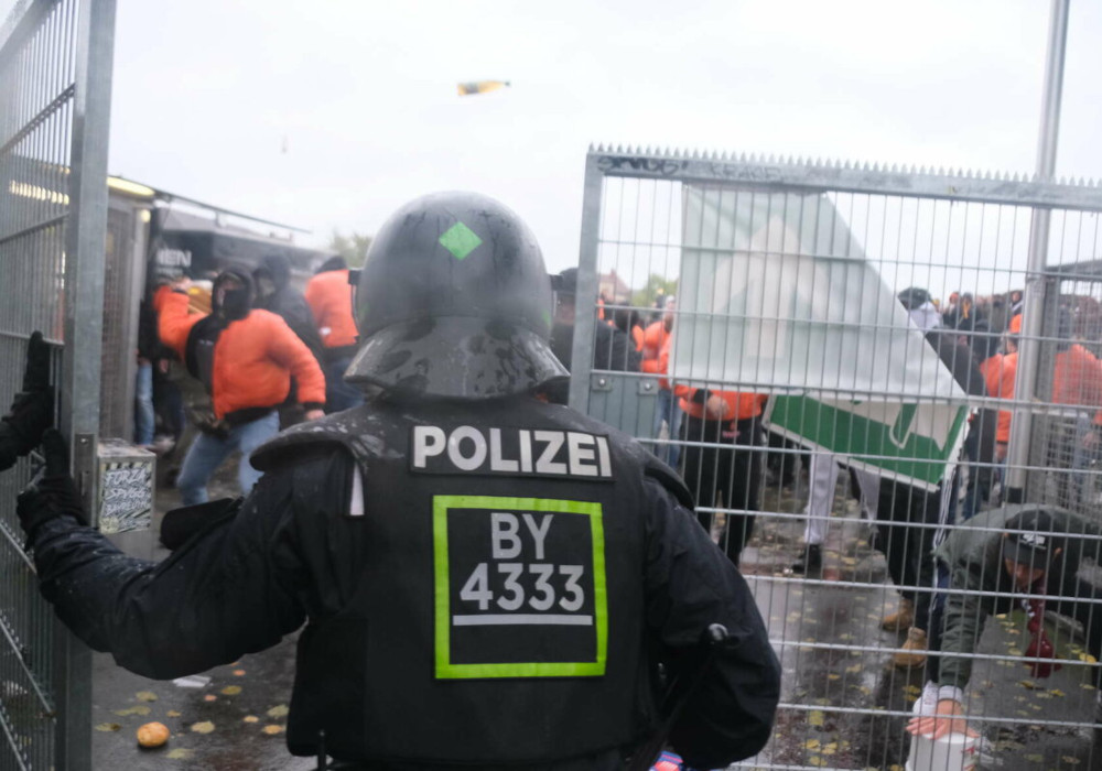 „Inzwischen konnten die Namen von 43 Tatverdächtigen ermittelt werden. Die Staatsanwaltschaft Bayreuth brachte bereits erste Verfahren zum Abschluss. Zum Beispiel erwirkte sie einen Untersuchungshaftbefehl gegen einen 30-jährigen vorbestraften Thüringer wegen tätlichen Angriffs auf Polizeibeamte und gefährlicher Körperverletzung. Der Haftbefehl ist inzwischen gegen Auflagen außer Vollzug gesetzt worden. Gegen weitere Tatverdächtige wurde jeweils Anklage zum Amtsgericht Bayreuth – Schöffengericht wegen Landfriedensbruchs im besonders schweren Fall, (versuchter) gefährlicher Körperverletzung, tätlichen Angriffs auf Vollstreckungsbeamte und Sachbeschädigung erhoben. Das Amtsgericht Bayreuth verurteilte einen mitgereisten Dresdner Anhänger, der bei seiner Ankunft am Bayreuther Bahnhof den Einsatzkräften den Mittelfinger gezeigt hatte, zur Zahlung einer Geldstrafe von 4.800 Euro. Die geplünderte Kasse aus dem Imbisswagen legt man einem damals 32-jährigen Tatverdächtigen zu Last, gegen einen 24-Jährigen ermittelt die EKO ebenfalls wegen der Plünderung. Zum Übergriff auf den Fotoreporter konnten sechs tatbeteiligte Personen identifiziert werden. In diesem Zusammenhang erwirkten die Ermittler Durchsuchungsbeschlüsse für die Wohnungen der Tatverdächtigen in Sachsen. Diese wurden bereits umgesetzt. Als Folgemaßnahme für die identifizierten Straftäter vom 1. Oktober 2022 sollen über die Spielvereinigung Bayreuth bundesweite Stadionverbote beim Deutschen Fußballbund erwirkt werden“, fassen Polizei und Staatsanwaltschaft die Ermittlungsergebnisse aus ihrer Sicht zusammen. (Faszination Fankurve, 15.09.2023)
