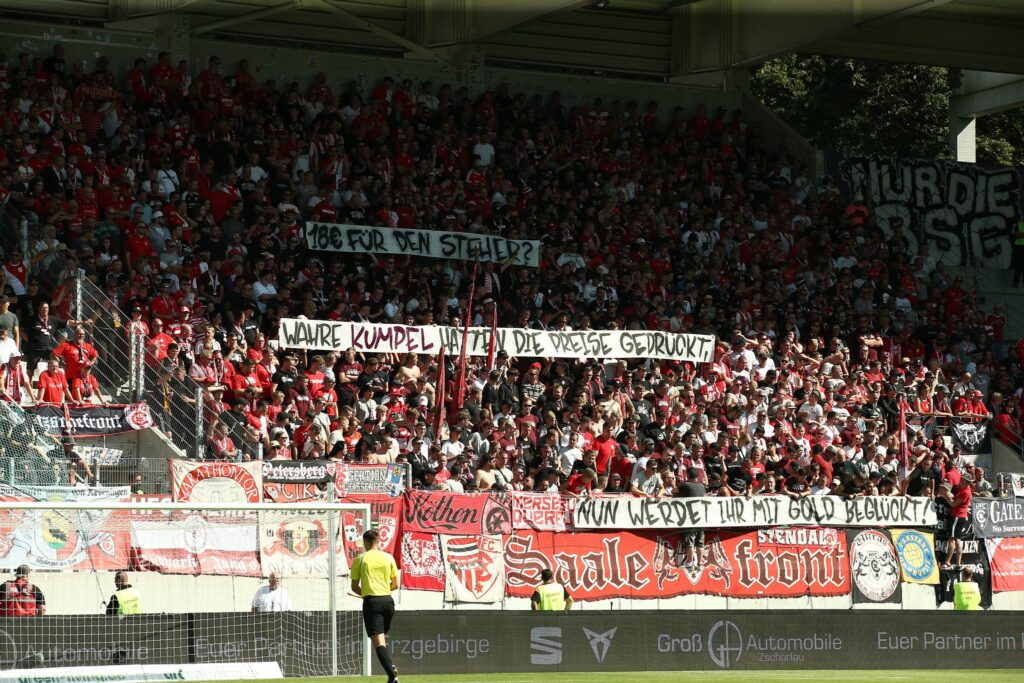 Weil Hallescher FC-Fans beim gestrigen Auswärtsspiel beim FC Erzgebirge Aue für eine Eintrittskarte im Stehplatzbereich des Gästeblocks 18 Euro zahlen mussten, organisierten die HFC-Ultras eine Protestaktion.