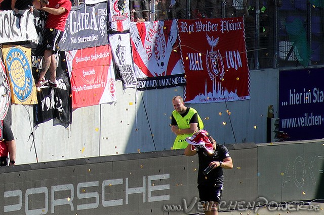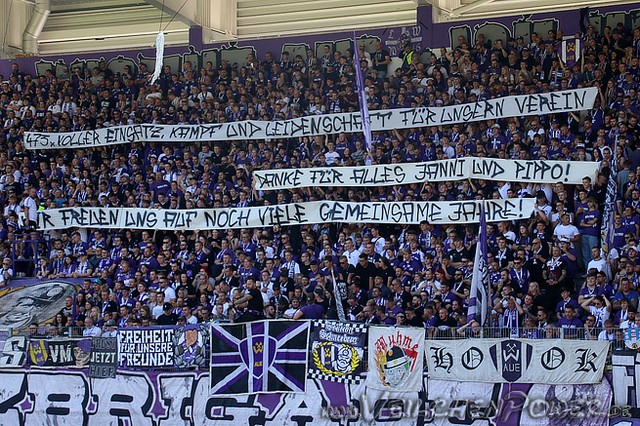 Die FC Erzgebirge Aue-Fans verabschiedeten sich beim Heimspiel gegen den HFC von Jan Hochscheidt und Philipp Riese, die zusammen 473 Pflichtspiele für Aue bestritten und ihre Laufbahnen als aktive Fußballer beendeten. „471 x voller Einsatz, Kampf und Leidenschaft für unseren Verein – Danke für alles Janni und Pippo! Wir freuen uns auf noch viele gemeinsame Jahre!“, honorierten die FC Erzgebirge-Fans diese Leistung.