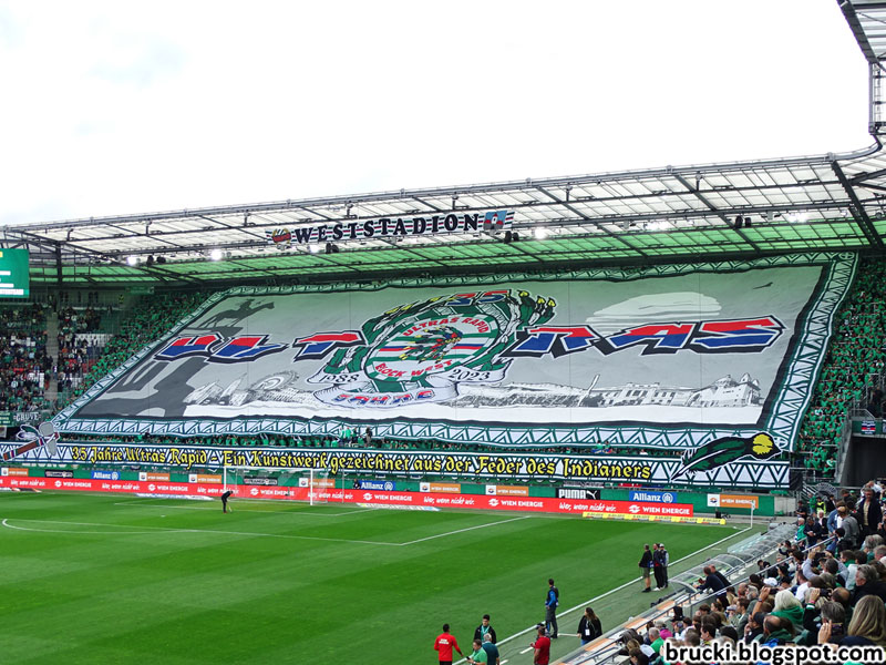 Zuerst wurde dabei ein Vorhang vorm Block West präsentiert, auf dem in der von den Ultras Rapid genutzten Schriftart „35 Jahre“ zu lesen war. Im Hintergrund waren in Schwarz-Weiß einige Choreografien aus der Gruppengeschichte zu sehen.