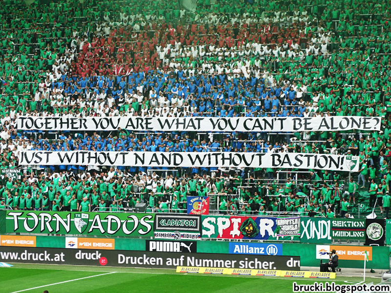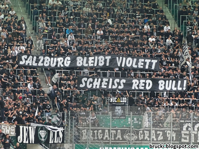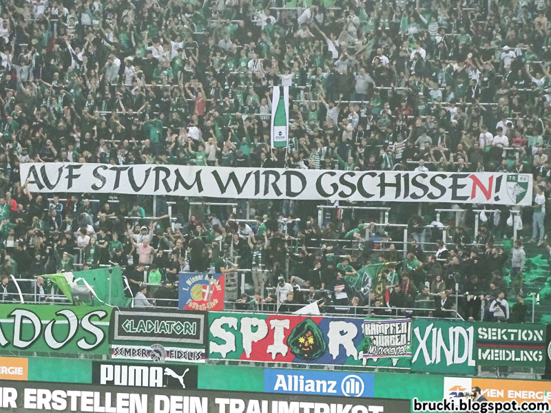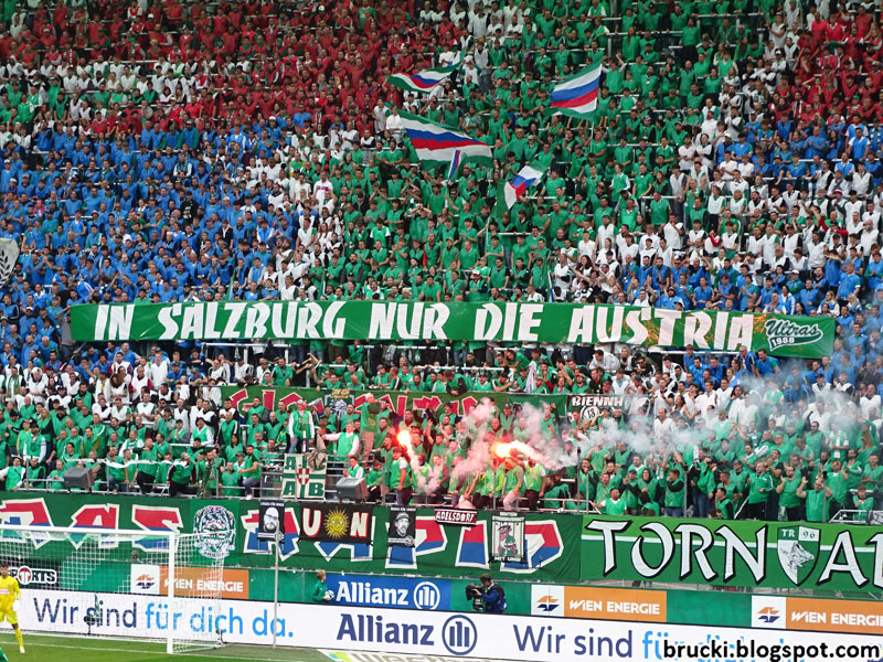 Mit „In Salzburg nur die Austria“ von den Ultras Rapid und „Salzburg bleibt violett- Scheiß Red Bull!“ im Gästeblock beteiligten sich beide Fanszenen gestern an Solidarisierungen mit der Austria Salzburg-Fanszene vor deren historischem Pokalspiel gegen Red Bull Salzburg.