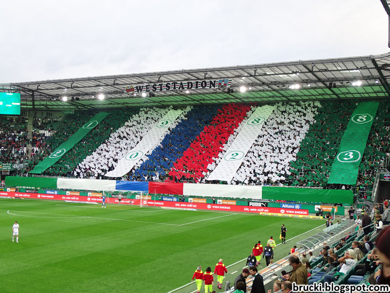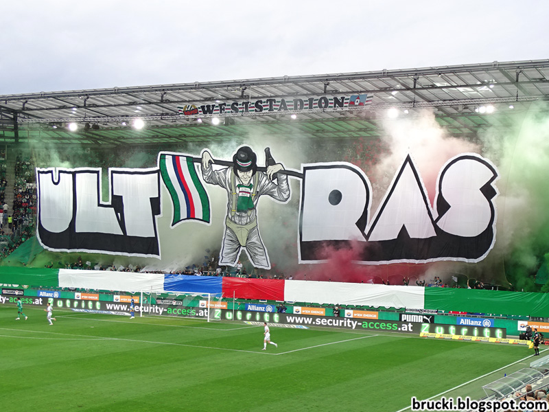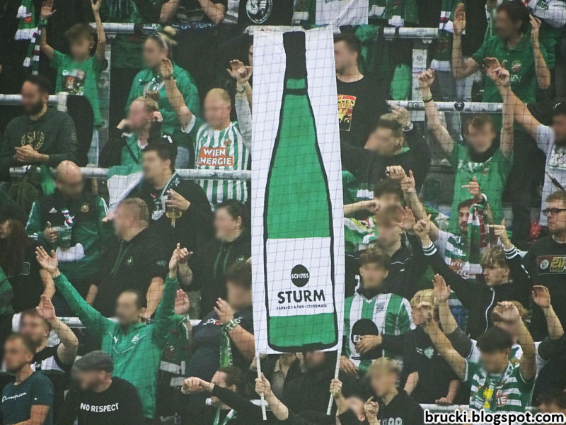 Als nächstes zogen sich die Rapid-Fans im Block West Plastik-Ponchos über, so dass die Zahl 35 über die gesamte Tribüne ergab. Mit einer Papptafel-Choreografie wurden danach immer wieder die Initialen „UR“ im Block West hochgehalten.