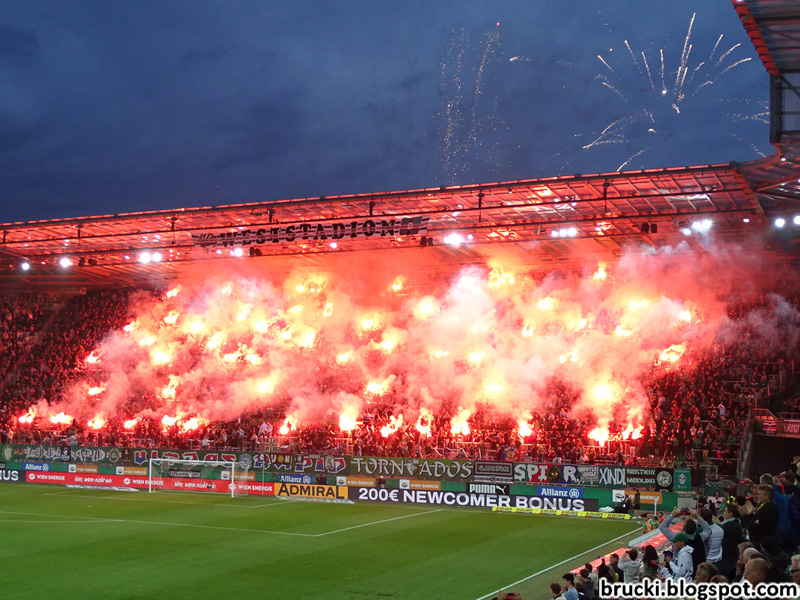 Die Rapid-Viertelstunde wurde mit Bengalischen Fackeln verteilt über den gesamten Block West eingeleitet und hinterm Block wurde ein Feuerwerk abgeschossen. In der 88. Spielminute feuerten die Ultras Rapid in Anlehnung an ihr Gründungsjahr noch Rauch ab, der erneut ein Balkenmuster ergab.