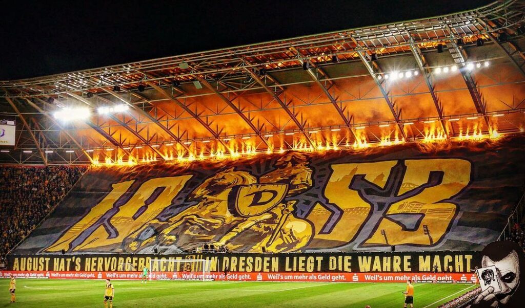 Der K-Block leitete das gestrige Sachsenderby der SG Dynamo Dresden gegen den FC Erzgebirge Aue mit einer großen Choreografie ein. „August hat’s hervorgebracht – In Dresden liegt die wahre Macht“, lautete das Motto der Aktion.