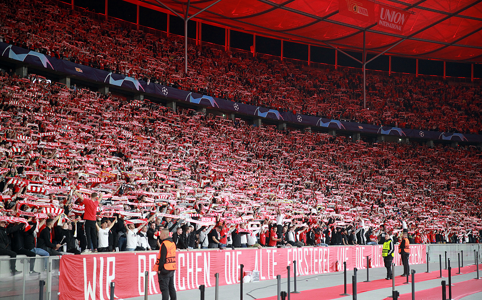 73.445 Fans kamen am Dienstagabend ins Olympiastadion Berlin, um das erste Champions League-Heimspiel des 1. FC Union zu sehen. Die aktive Fanszene aus Berlin-Köpenick verzichtete wegen des Umzugs ans andere Ende der Stadt auf optische Stilmittel.