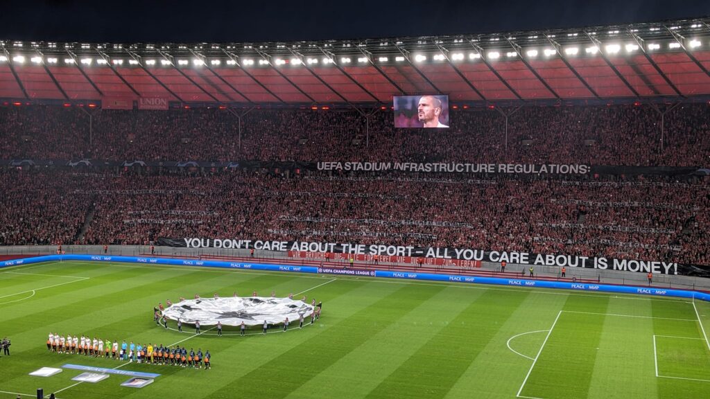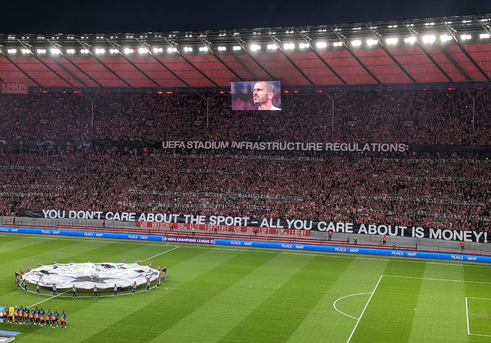 Vor Anpfiff protestierten die Union-Fans gegen die Regularien der UEFA zur Stadioninfrastruktur. “UEFA stadium infrastructure regulations: You don’t care about the sport – all your care about is money!”, stand dazu auf Spruchbändern der Union-Fans geschrieben. Der Vorwurf in Richtung UEFA lautete somit, dass die Vorgaben zur Stadioninfrakstruktur in der Königsklasse nicht dem Sport, sondern dem Einnahmeninteresse der UEFA dienen würden. Auf einzelnen Plakaten wurden dabei Regeln der UEFA aufgelistet, die in den Augen der Union-Fans für eine Gewinnmaximierung sorgen und gegen Faninteressen stehen.