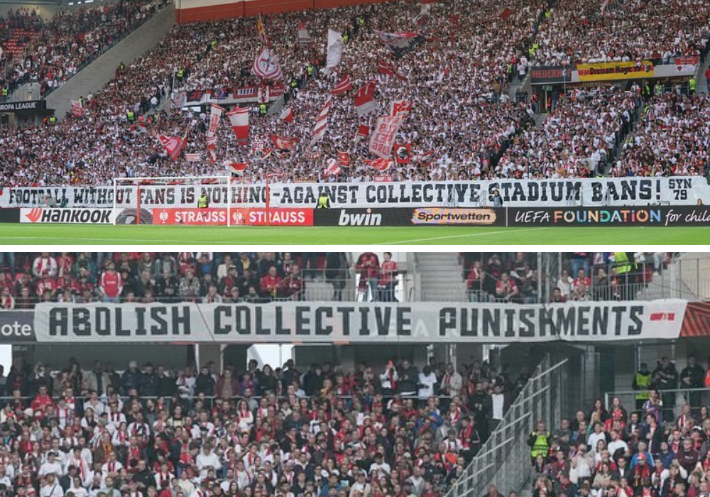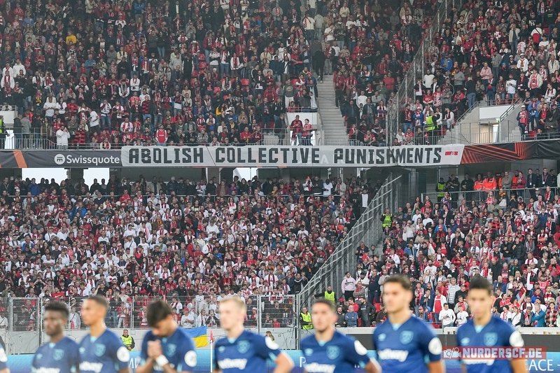 Die Ultras des SC Freiburg solidarisierten sich mit den West Ham-Fans und zeigten beim gestrigen Heimspiel passende Spruchbänder. „Football without fans is nothing – against collective stadium bans!”, stand auf einem Spruchband der Synthesia Ultras vorm Heimblock geschrieben. IWF 12 platzierte am eigentlichen Gästeblock eine „Abolish collective punishments“-Botschaft. West Ham United gewann das gestrige Auswärtsspiel in Freiburg mit 2:1. (Faszination Fankurve, 06.10.2023)