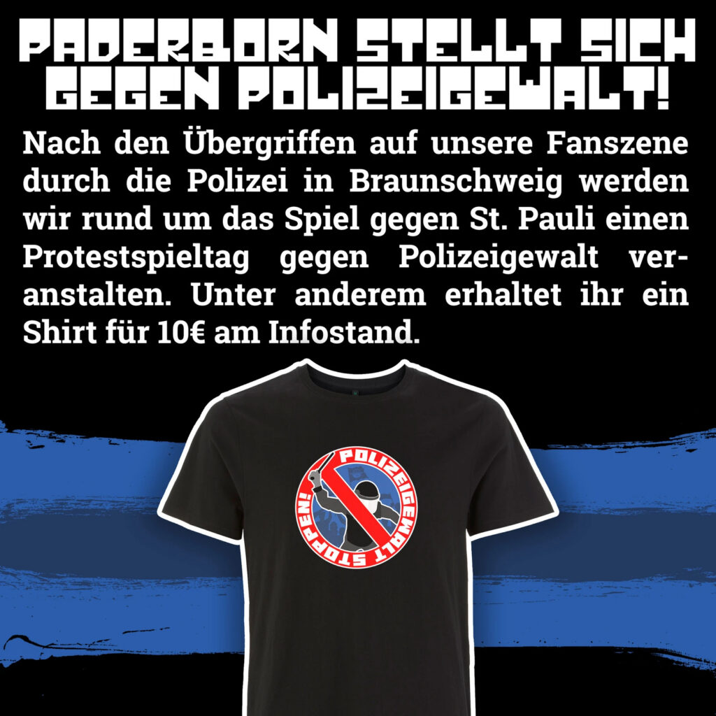 Zum Aktionsspieltag wurde vor Spielbeginn eine kleine Blockfahne präsentiert, auf der in Form eines Verbotsschildes ein Polizist mit Schlagstock abgebildet war. Am roten Rand stand der Schriftzug „Polizeigewalt stoppen!“. Vor der Tribüne wurde dazu ein Banner ausgerollt, auf dem es hieß: „Paderborn stellt sich gegen Polizeigewalt!“.