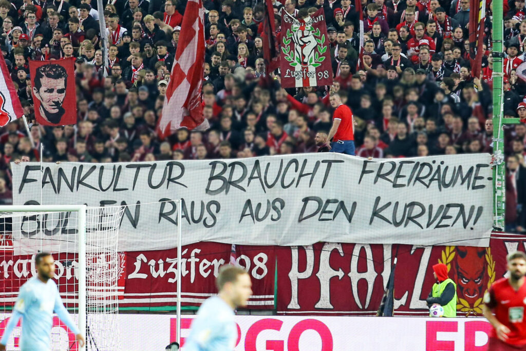 „Fankultur braucht Freiräume – Bullen raus aus den Kurven!“, lautete eine weitere Botschaft der FCK-Ultras. Zu Beginn der zweiten Halbzeit präsentierten FCK-Ultras noch ein Spruchband zum 103. Geburtstag von Fritz Walter: „Für immer in Ehren: Fritz Walter und sein Stadion“, war darauf zu lesen. (Faszination Fankurve, 01.11.2023)