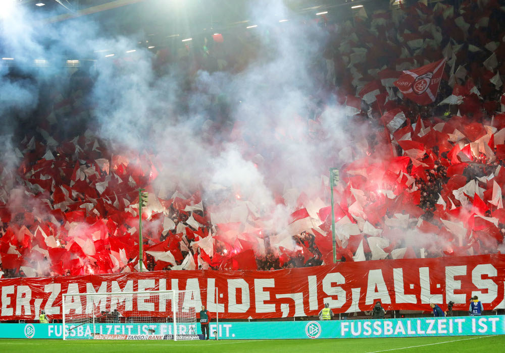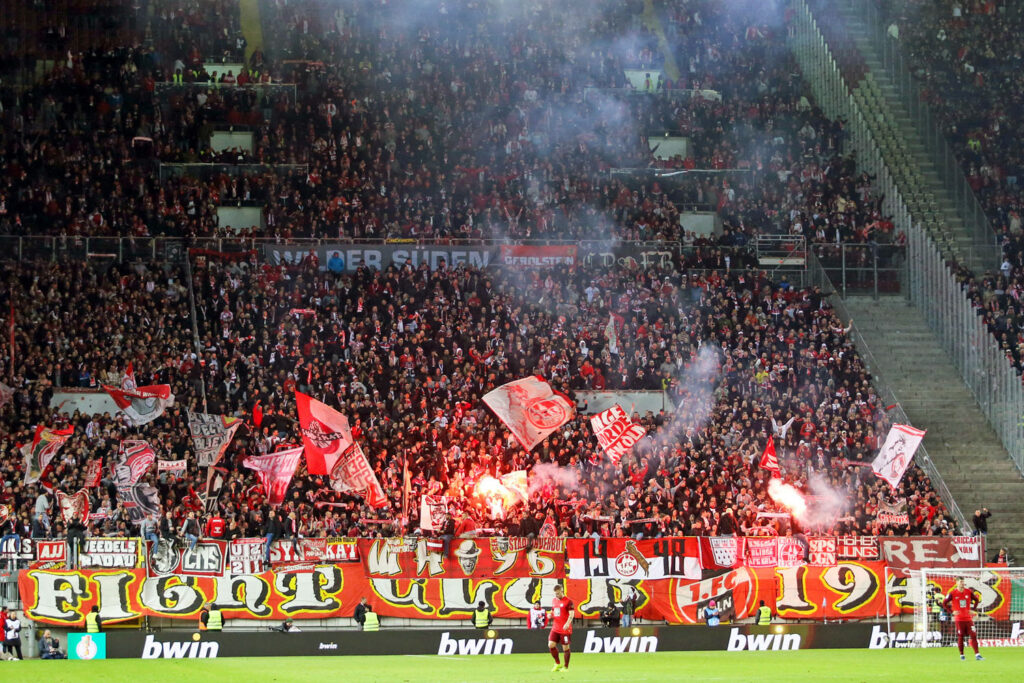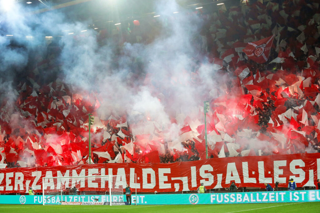 In der Westkurve organisierten die FCK-Ultras ein Intro mit rot-weißen Fahnen, blinkenden Stroboskopen und einem „Wann Pälzer zammehalde, is alles meglich!“-Spruchband. Dieses war angelehnt an ein Zitat von FCK-Ehrenpräsident Norbert Thines. Im Gästeblock machten sich 5.000 Kölner Fans hinter der Fight Club 1948-Fahne breit. Auch neben dem eigentlichen Gästeblock waren noch Kölner Fans zu sehen.
