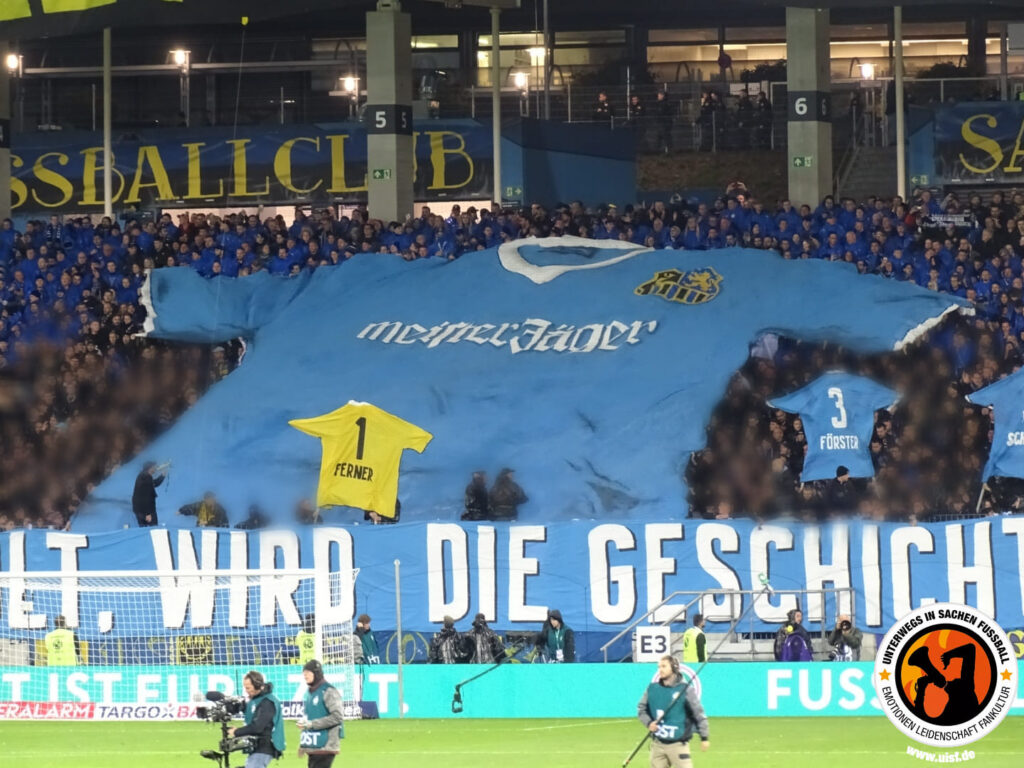 In der Virage Est wurde das Pokalspiel mit einer Choreografie eingeleitet, die den 6:1 Heimerfolg des FCS gegen den FC Bayern am 30. Spieltag der Bundesliga-Saison 1976/77 zum Thema hatte. „Nach tristen Jahren gut erholt, wird die Geschichte heute wiederholt“, lautete das Motto der Aktion. Ein großes Trikot mit „Meister-Jäger“-Schriftzug statt des damaligen „Jägermeister“-Sponsorenaufdrucks bedeckte Teile der Virage Est. Kleinere Trikots mit den Namen der damaligen FCS-Spieler waren über die Tribüne verteilt. Mit schwarzen und blauen Plastikponchos wurde die Heimkurve aufgeteilt. Pyrotechnik kam dort ebenfalls zum Einsatz.
