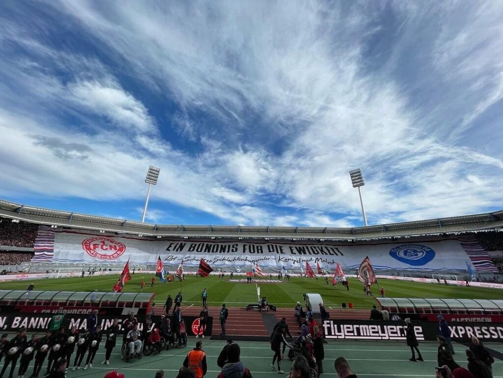 Im heutigen Spiel der 2. Bundesliga zwischen dem 1. FC Nürnberg und dem FC Schalke 04 zeigten die beiden befreundeten Fanszenen vor Spielbeginn eine große gemeinsame Blockfahne, die sich über die gesamte Gegentribüne des Max-Morlock-Stadions erstreckte.