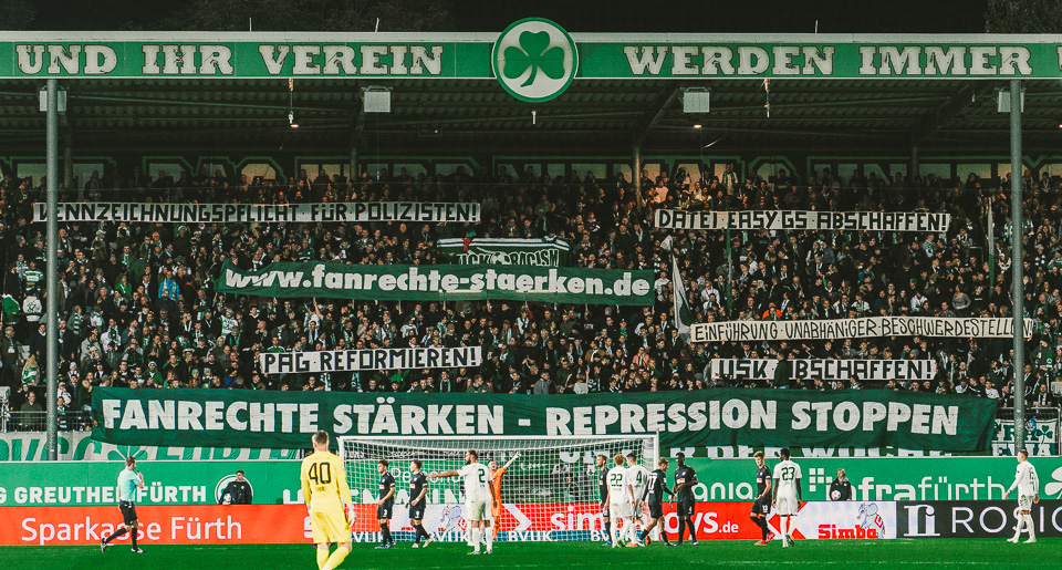 Außerdem kritisieren die Fanhilfen die Bundesregierung, weil bei der Einführung einer Kennzeichnungspflicht oder der Reform der Datei Gewalttäter Sport bisher keine Fortschritte zu vermelden seien. (Faszination Fankurve, 10.11.2023)