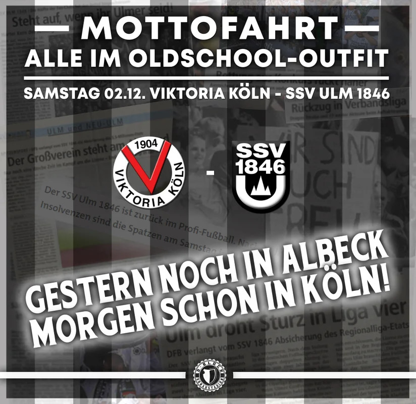 „Gestern noch in Albeck, morgen schon in Köln…“, lautet die Zeile aus einem beliebten Fangesang der Ulmer. „Kein anderes Lied hat uns so lange begleitet und steht stellvertretend für all die Höhen und Tiefen, die wir mit diesem Verein schon erlebt haben“, erklärt der D-Block dazu auf seiner Internetseite. Nun spielt der SSV Ulm nach vielen Jahren wieder in Köln und diese Auswärtsfahrt soll durch das Oldschool-Motto entsprechend gewürdigt werden.