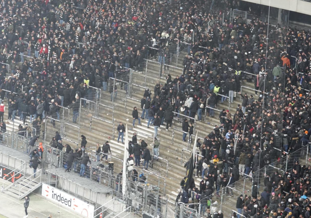 Am gesamten Spieltag kam es zu keinerlei Auseinandersetzungen zwischen den Fangruppen, weder vor, noch nach dem Spiel. Auch die von der Polizei Frankfurt über Twitter/X um 18:06 Uhr verbreitete gesuchte Eskalation rivalisierender Fangruppen” hat schlichtweg nicht stattgefunden. Vielmehr kam es vor Block 40 zu einer versuchten Festnahme durch eine zivil gekleidete Person, mutmaßlich weil keine korrekte Eintrittskarte vorlag. Wenige Sekunden später stand bereits die Polizei inklusive Videoüberwachungsmaßnahmen parat und betrat massiv den Bereich vor Block 40. Die Einheiten müssen also für diesen Einsatz bereits parat gestanden haben.
