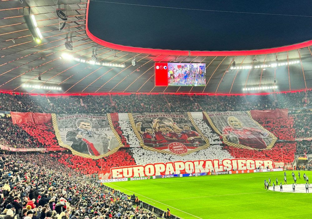Mit einer Choreografie bestehend aus drei Wimpeln leiteten die FC Bayern München-Fans das heutige Champions League-Heimspiel gegen den FC Kopenhagen ein. „Wir haben den Cup gewonnen! Den Thron erklommen! Der Arjen hat’s gemacht!“, war dabei in der Südkurve zu lesen.
