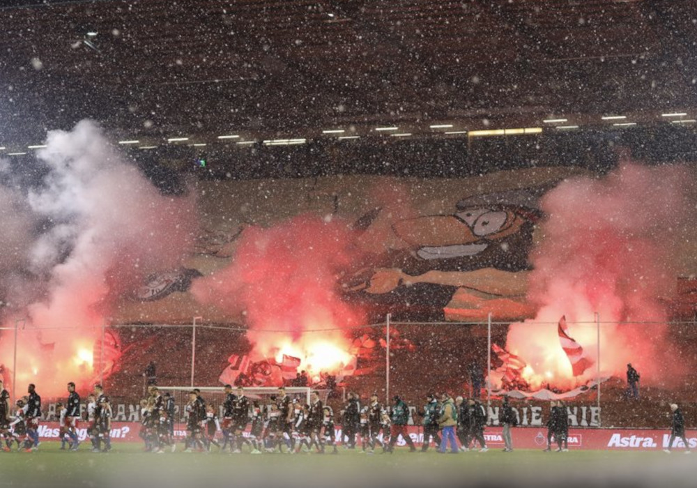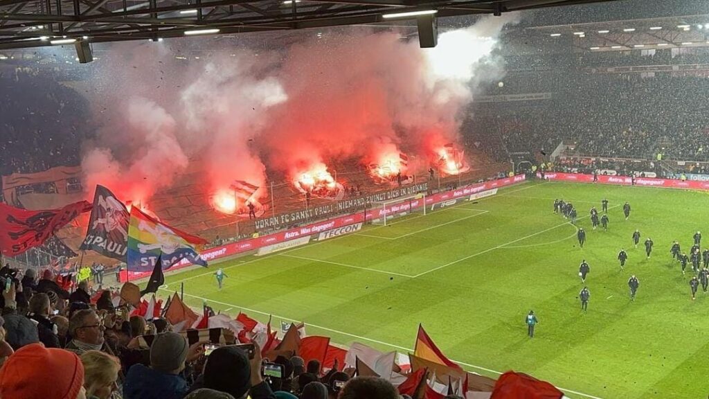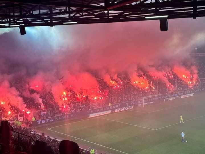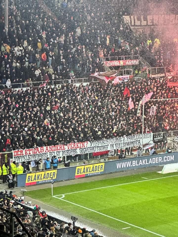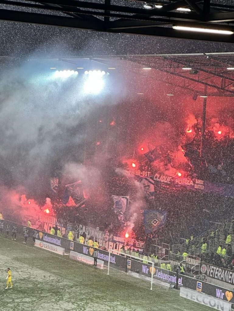 Die Polizei war mit über 1.700 Kräften im Einsatz. Auf dem Rasen gingen die Kiezkicker durch ein ein spektakuläres Eigentor mit 2:0 in Führung. 29.153 Fans im ausverkauften Millentor sahen am Ende ein 2:2 im Spitzenspiel der 2. Bundesliga. Die HSV-Fanszene zog nach Abpfiff unter Polizei-Begleitung in Richtung Reeperbahn. (Faszination Fankurve, 01.12.2023)