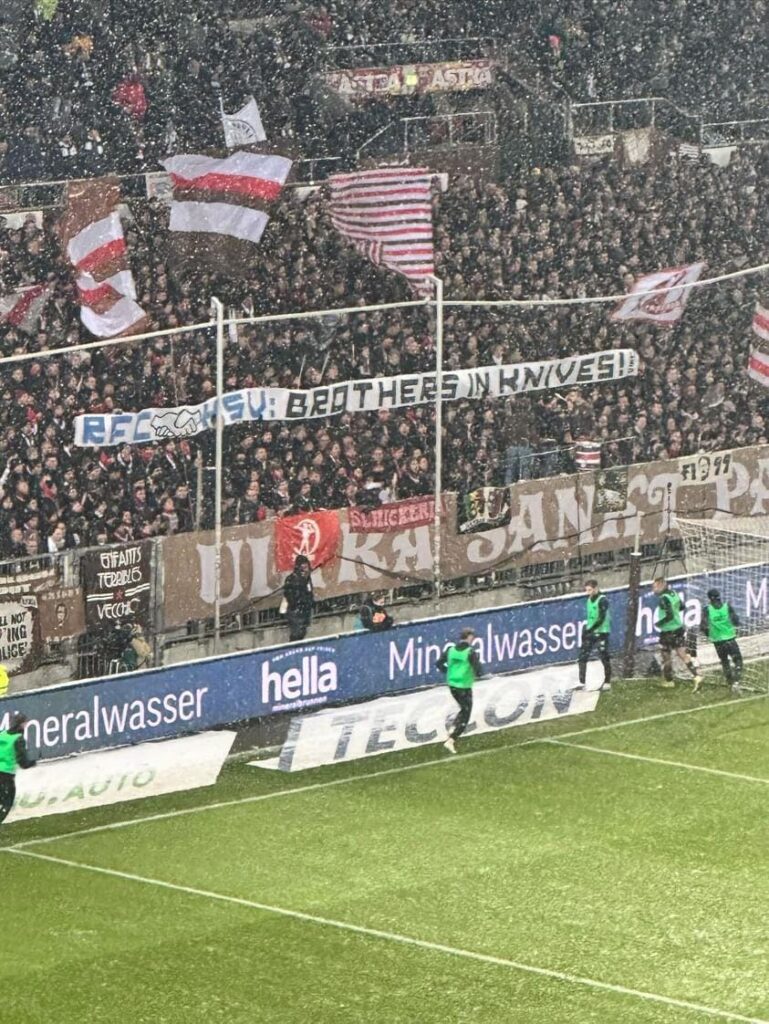 Ein weiteres Spruchband der FC St. Pauli-Anhänger ging in Richtung eigener Vereinsführung: „Der etwas andere Verein? Vorverurteilung & Paralleljustiz Doppelstandards bei SV Vergabe Sicherheitschef in Bullenmanier!“ Der FC St. Pauli hat vor rund einer Woche mehre Fans des eigenen Vereins mit einem einjährigen Stadionverbot belegt. Diese sollen das Millerntor-Stadion beim letzten Stadtderby am 14. Oktober 2022 ohne Eintrittskarte betreten haben.