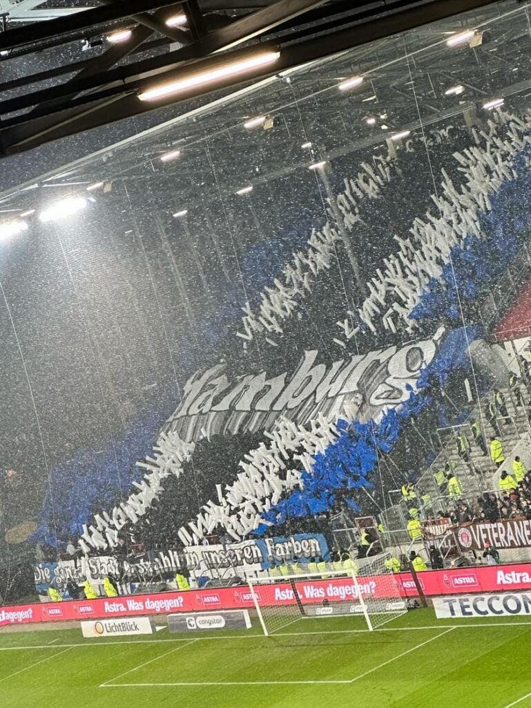 Vor dem Anpfiff des heutigen Stadtderbys zwischen dem FC St. Pauli und dem Hamburger SV zeigten die Anhänger beider Vereine Choreografien in ihren Blöcken. Dabei wurde von beiden Seiten auch Pyrotechnik eingesetzt.