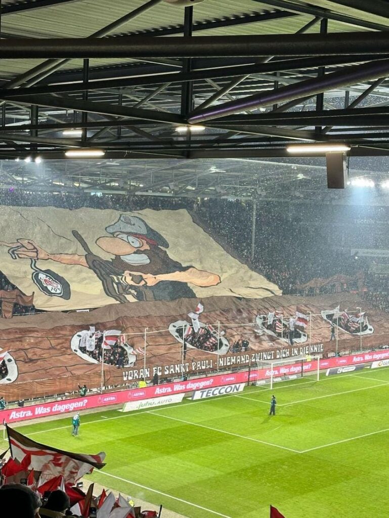 Die Heimfans präsentierten auf der gesamten Südkurve eine große Blockfahne in der Form eines Piratenschiffs. In den Bullaugen des Schiffs wurden zuerst die Fahnen geschwungen, im zweiten Teil entzündeten die Ultras hier viele rote Fackeln. Vor der Südkurve stand auf einem Spruchband geschrieben: „Voran FC Sankt Pauli – Niemand zwingt dich in die Knie“.