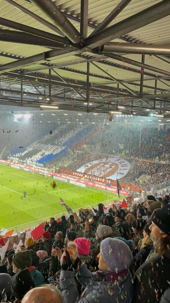 Auf der gegenüberliegenden Nordtribüne wurde im Heimbereich neben dem Gästeblock außerdem noch eine Blockfahne präsentiert, die das Vereinswappen des FC St. Pauli zeigte. Auf einem Spruchband stand hier geschrieben: „Voran magischer FC“. Auch auf der Gegengerade ergab sich durch viele braune, weiße und rote Fähnchen ein schönes Bild.