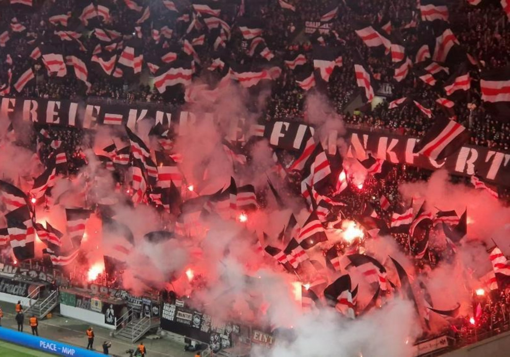 Ultras von Eintracht Frankfurt leiteten das Conference League-Heimspiel gegen PAOK Saloniki mit einem Intro aus einheitlichen Schwenkfahnen und Pyrotechnik in der Nordwestkurve ein. Dazu wurde eine „Freie Kurve Fankfurt“-Botschaft präsentiert.