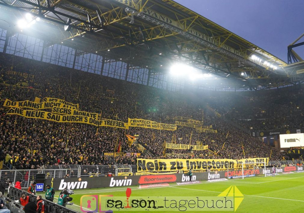 Deshalb rufen wir zum kommenden Heimspiel gegen Leipzig (09.12.2023) jeden einzelnen Borussen und jeden Fanclub erneut dazu auf: Informiert euch sowie eure Freunde und drückt euren Unmut über den geplanten Investoreneinstieg aus. Bereitet dabei gerne auch Schilder oder Spruchbänder vor, die von einem ganz einfachen „Nein zu Investoren in der DFL!“ bis hin zu kreativen Lösungen reichen können. Eurer Kreativität sind keine Grenzen gesetzt. Die Aktion wird zu Beginn der zweiten Halbzeit stattfinden, wenn unsere Schwarzgelben traditionell auf die Südtribüne spielen.