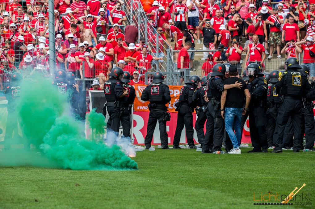 Weiterhin ungeklärt ist, wie ein Sicherheitstor am Gästebereich geöffnet werden konnte, zudem war in jedem Fall eine unzureichende personelle Sicherung durch den eingesetzten Ordnungsdienst gegeben. Das sofortige Hinzuziehen der Polizei führte binnen weniger Augenblicke sowohl zur Schließung dieses Tores als auch einer Befriedung der Situation, so dass ein weiteres Vorgehen sowie eine fortwährende massive Polizeipräsenz unangebracht erscheinen.